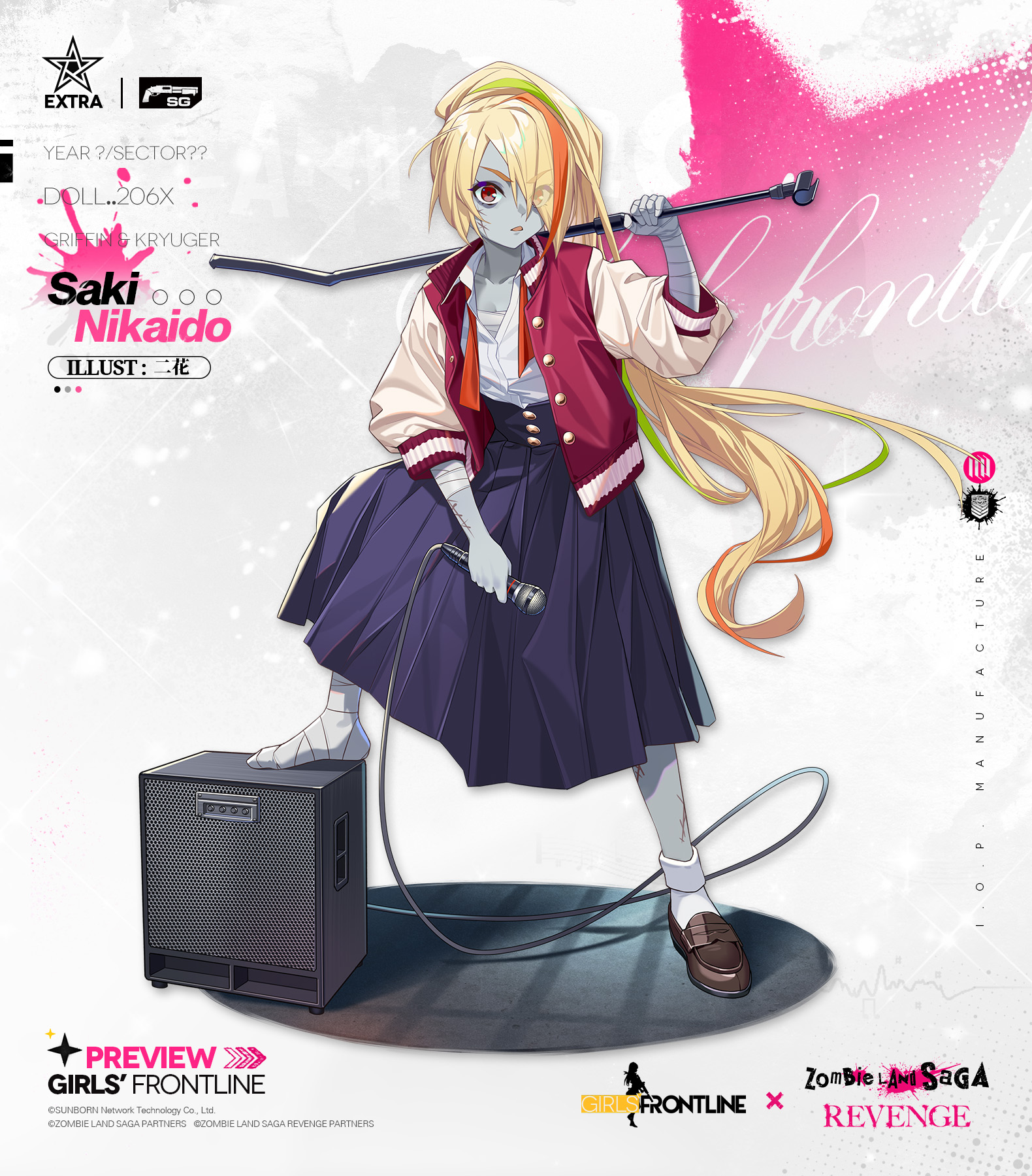 1girl ankle_socks bandages blonde_hair blue_skirt brown_shoes cable character_name collarbone colored_skin commentary crossover english_commentary eyes_visible_through_hair full_body girls'_frontline green_eyes grey_skin hair_over_one_eye high-waist_skirt highres holding holding_microphone holding_microphone_stand jacket letterman_jacket long_hair looking_at_viewer microphone microphone_stand multicolored_hair multicolored_jacket necktie nikaidou_saki official_art open_clothes open_jacket open_mouth orange_hair orange_necktie pleated_skirt ponytail red_eyes red_jacket scar scar_on_arm scar_on_face scar_on_leg shirt shirt_tucked_in shoes short_sleeves single_shoe skirt socks solo speaker streaked_hair triangle_mouth two-tone_jacket unbuttoned unbuttoned_shirt undone_necktie white_shirt white_socks yitiao_er-hua zombie zombie_land_saga
