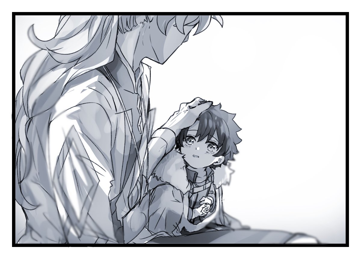 2boys aged_down border chaldea_uniform child cloak collared_shirt command_spell fate/grand_order fate_(series) fujimaru_ritsuka_(male) fur-trimmed_cloak fur_trim gloves greyscale hair_between_eyes head_out_of_frame headpat id_card lab_coat lanyard long_hair looking_at_another looking_up male_focus monochrome multiple_boys parted_lips ponytail romani_archaman shirt short_hair simple_background upper_body white_background white_border yukinaga_(asuten)