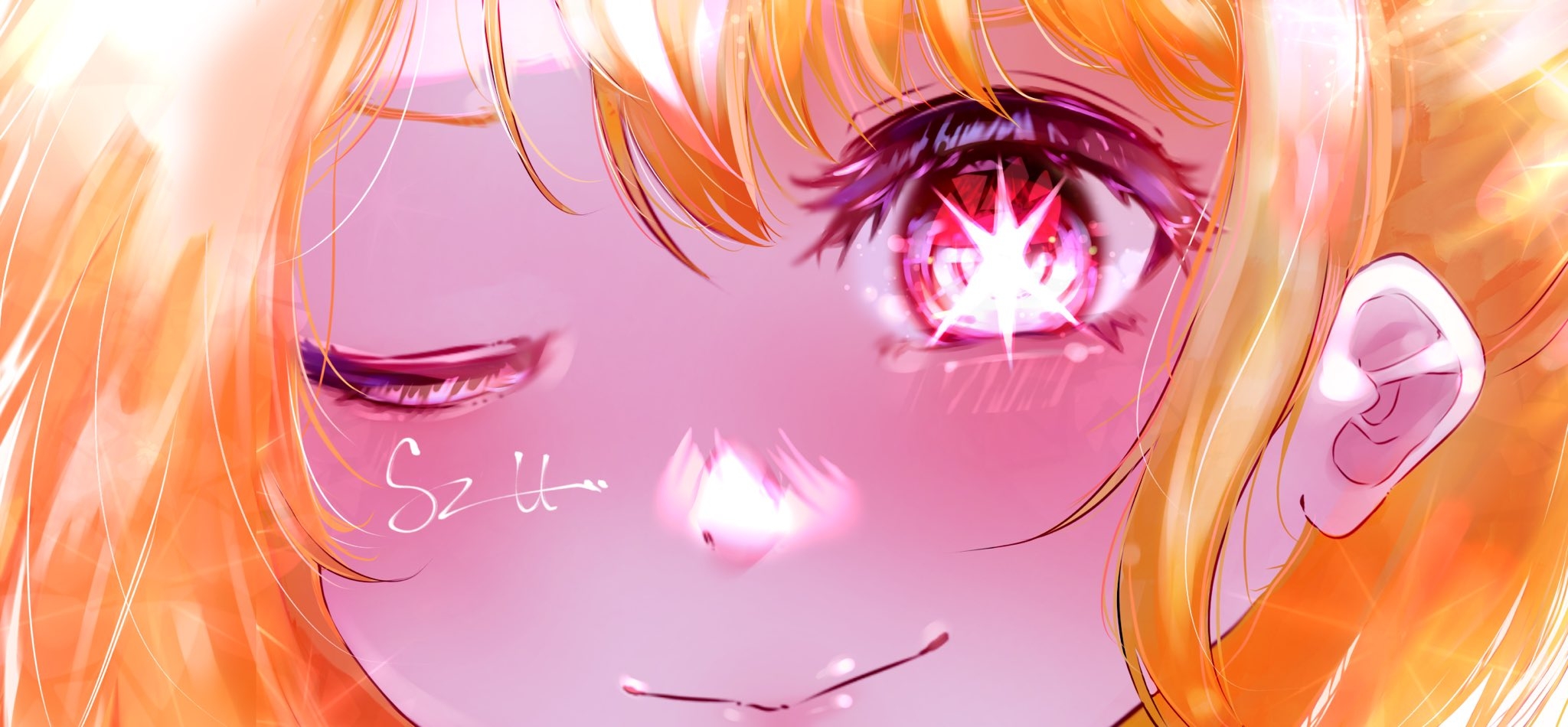 1girl artist_name blonde_hair blush close-up closed_mouth commentary_request eye_focus highres hoshino_ruby one_eye_closed oshi_no_ko partial_commentary pink_eyes sizu_picture solo star-shaped_pupils star_(symbol) symbol-shaped_pupils