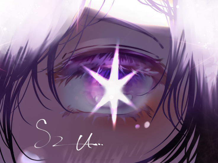 1girl artist_name close-up colored_eyelashes commentary_request eye_focus eyelashes hoshino_ai oshi_no_ko partial_commentary purple_eyes purple_hair sizu_picture star-shaped_pupils star_(symbol) symbol-shaped_pupils