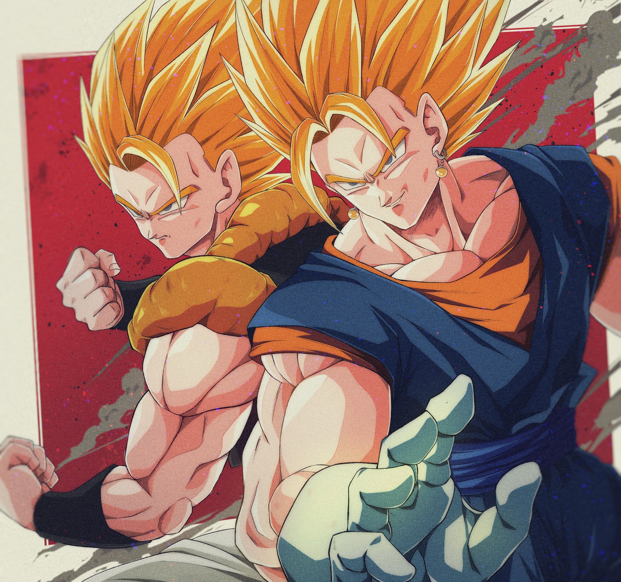 2boys back-to-back biceps blonde_hair blue_sash border bure_(fantasticyouth7) clenched_hands closed_mouth commentary_request dougi dragon_ball dragonball_z earrings frown gloves gogeta green_eyes hand_up highres jewelry looking_away male_focus metamoran_vest multiple_boys muscular muscular_male orange_shirt outside_border pants parted_lips potara_earrings red_background sash serious shirt short_sleeves simple_background spiked_hair super_saiyan super_saiyan_1 v-shaped_eyebrows vegetto vest white_border white_gloves white_pants