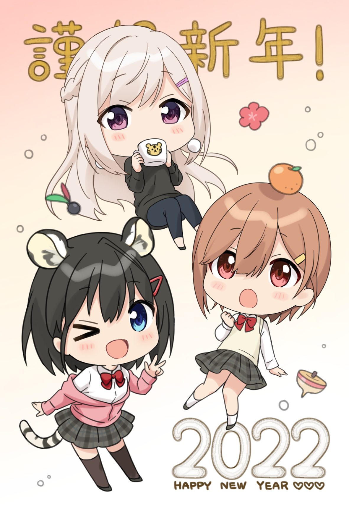 >_o 2022 3girls animal_ears azuki_yui black_hair black_pants black_shirt black_skirt blue_eyes blush braid brown_hair chibi cup flower food food_on_head fruit gradient_background grey_hair hair_between_eyes hair_ornament hairclip happy_new_year highres holding holding_cup long_hair mandarin_orange multiple_girls new_year object_on_head one_eye_closed open_mouth original pants pink_flower pink_sweater plaid_clothes plaid_skirt purple_eyes red_eyes school_uniform shadow shirt short_hair skirt socks spinning_top sweater tail thighhighs triangle_hair_ornament white_shirt white_socks