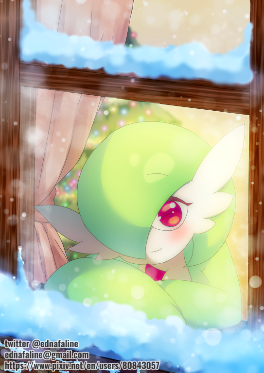 1girl artist_name blurry blurry_background blush bob_cut breasts christmas christmas_tree closed_mouth colored_skin crossed_arms curtains edna_faline email_address female_focus from_outside gardevoir gen_3_pokemon green_hair green_skin hair_over_one_eye happy looking_at_viewer medium_breasts multicolored_skin nintendo one_eye_covered pixiv_id pokemon pokemon_(creature) red_eyes short_hair smile snow snowing solo twitter_username two-tone_skin upper_body watermark web_address white_skin window winter