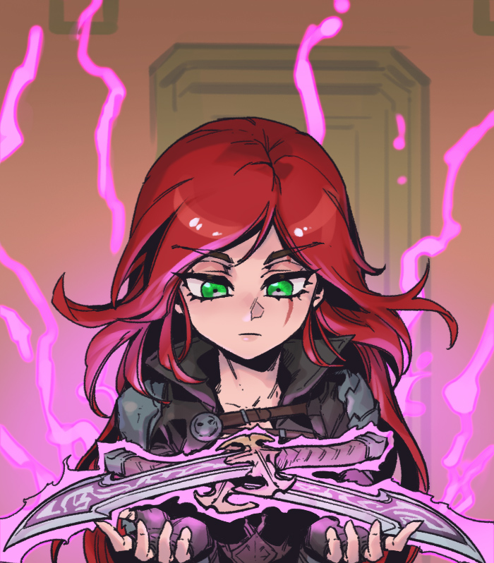 1girl black_gloves brown_jacket dagger fingerless_gloves gloves green_eyes holding holding_weapon indoors jacket katarina_(league_of_legends) knife league_of_legends long_hair looking_at_object looking_down magic open_clothes open_jacket phantom_cross red_hair scar scar_across_eye scar_on_face shoulder_plates solo weapon