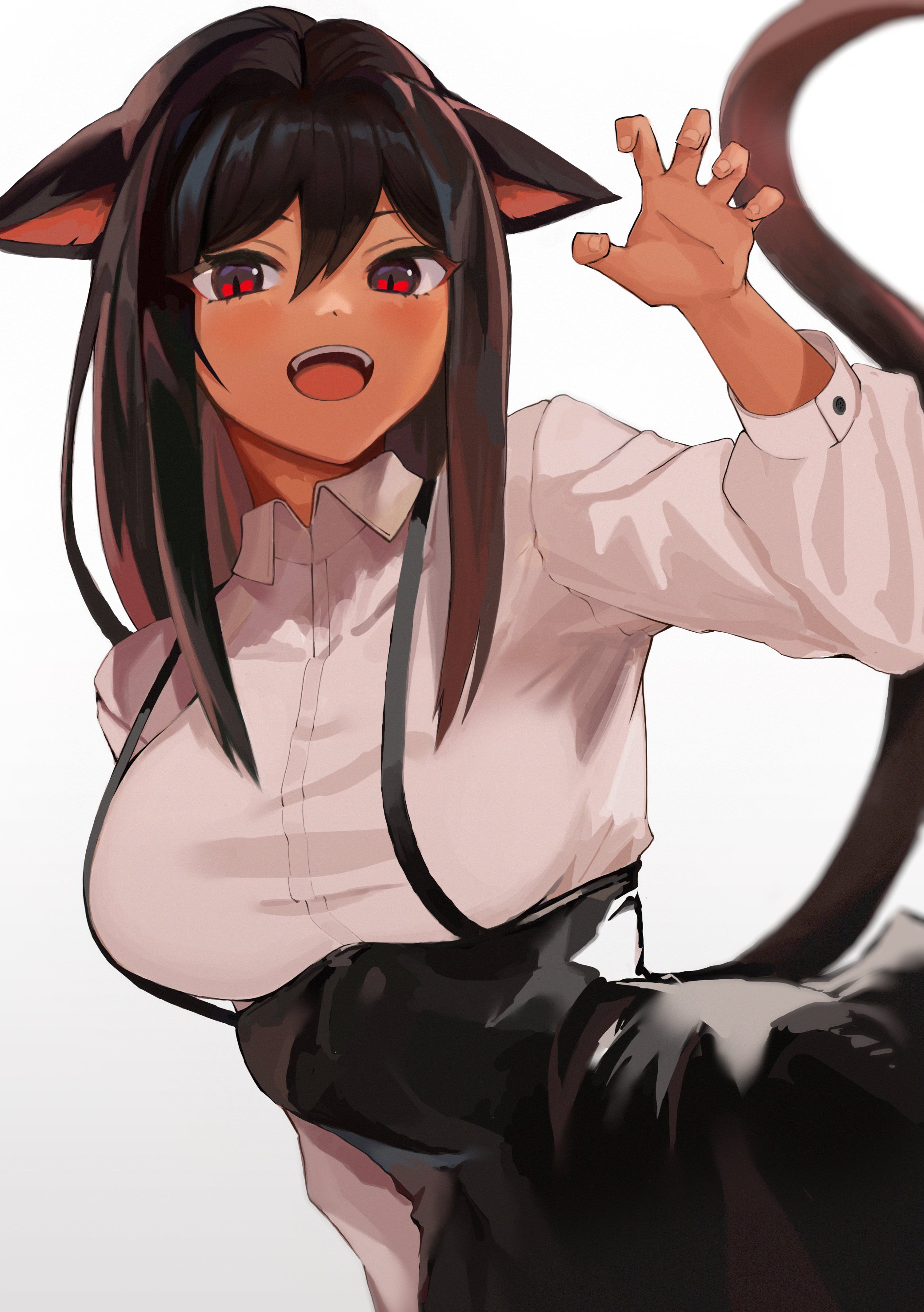 1girl absurdres animal_ears black_hair black_skirt blurry breasts cat_ears cat_girl cat_tail claw_pose collared_shirt cyobiro depth_of_field dress_shirt hair_between_eyes hand_up highres large_breasts long_hair long_sleeves looking_at_viewer open_mouth original red_eyes shirt skirt slit_pupils smile solo suspender_skirt suspenders tail upper_body white_background white_shirt