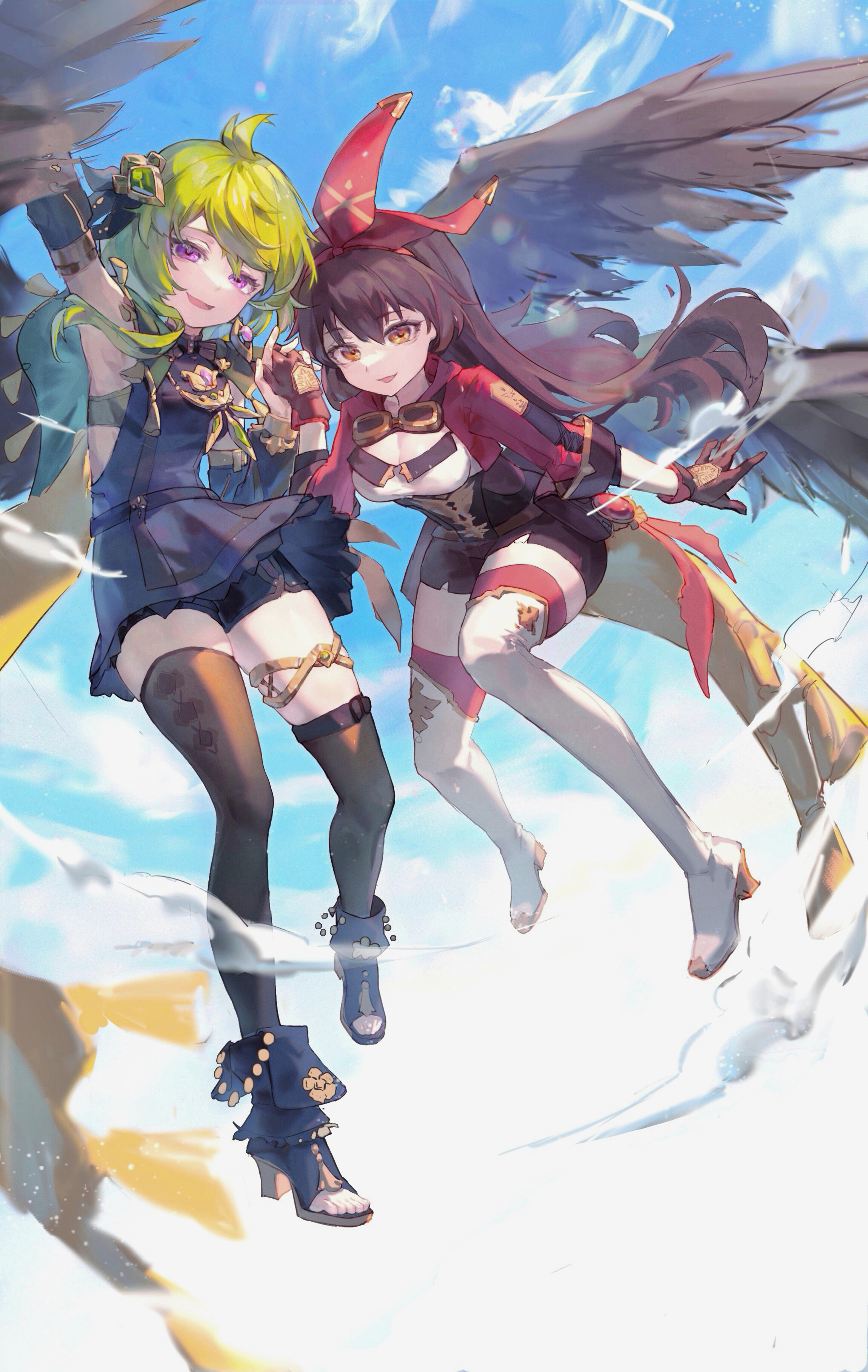 2girls :d absurdres ahoge amber_(genshin_impact) arm_up black_dress black_hair black_shorts black_thighhighs black_wings boots bow bow_hairband breasts brown_gloves cloak cloud collei_(genshin_impact) day dress feathered_wings flying gem genshin_impact gloves goggles goggles_around_neck gold_trim green_gem green_hair hairband highres holding_hands jewelry long_hair long_sleeves looking_at_viewer multiple_girls open_mouth orange_eyes outdoors pink_gem platform_boots platform_footwear purple_eyes red_bow red_shirt shirt short_hair shorts sky sleeveless sleeveless_dress small_breasts smile thigh_boots thighhighs thighlet white_footwear wings xiaoxiaoanye yuri