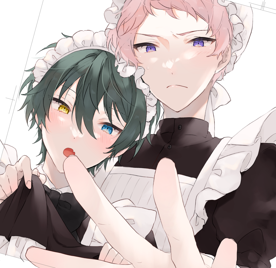 2boys :o apron black_bow black_bowtie blue_eyes bow bowtie closed_mouth commentary_request ensemble_stars! fang green_hair hair_between_eyes heterochromia itsuki_shu kagehira_mika maid_apron maid_headdress male_focus mizuki1103 multiple_boys open_mouth pink_hair purple_eyes short_hair valkyrie_(ensemble_stars!) white_background yellow_eyes
