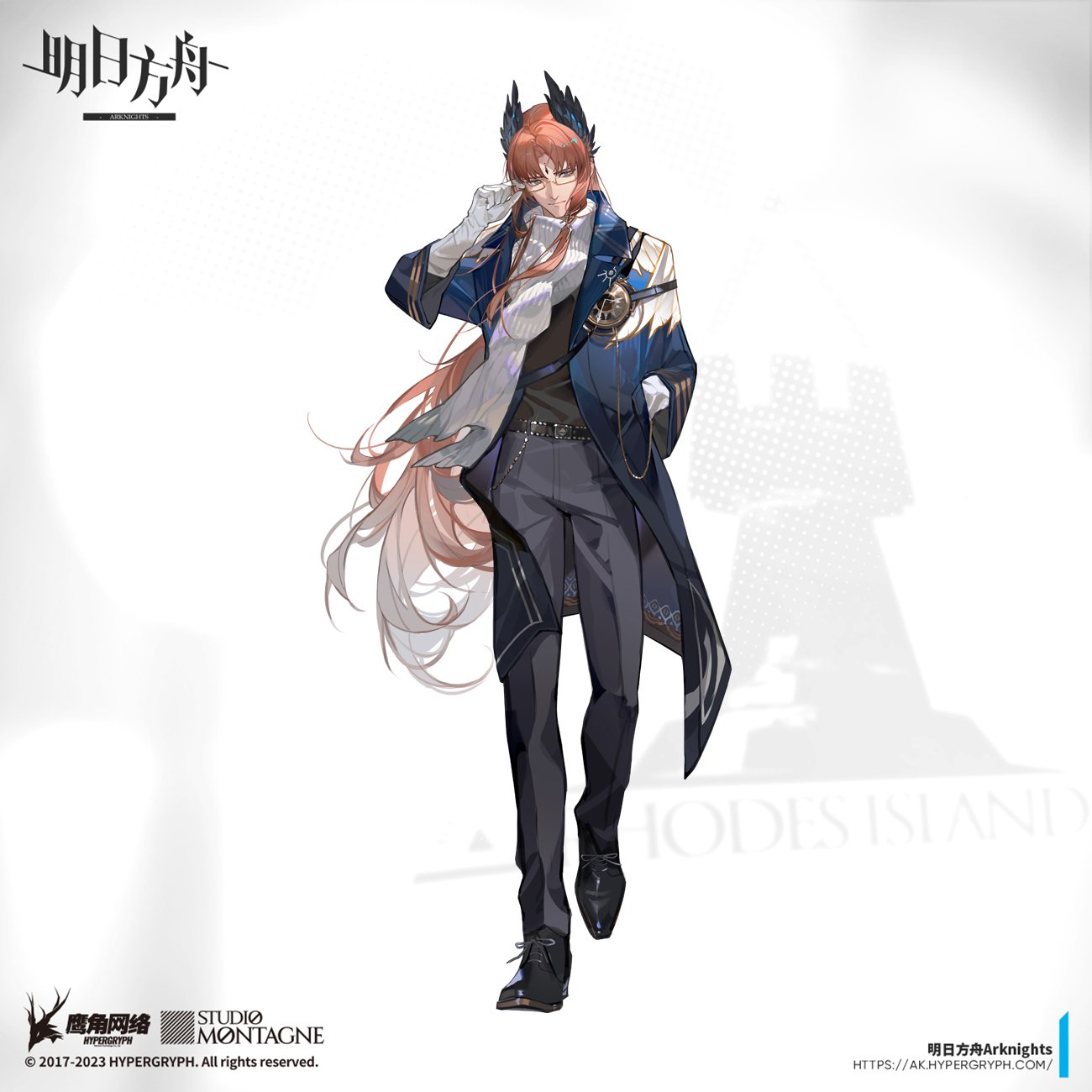 1boy adjusting_eyewear akai_999 alternate_costume arknights belt belt_buckle bespectacled black_belt black_pants black_shirt black_shoes blue_coat blue_eyes buckle closed_mouth coat copyright_notice dress_shoes floating_scarf forehead_jewel full_body glasses gloves hair_ribbon hand_in_pocket head_wings highres light_smile long_hair looking_at_viewer male_focus official_art open_clothes open_coat orange_hair pants parted_bangs passenger_(arknights) passenger_(ipstar)_(arknights) rhodes_island_logo_(arknights) ribbon scarf shirt shoes smile solo standing tress_ribbon white_background white_gloves white_scarf wing_print wings