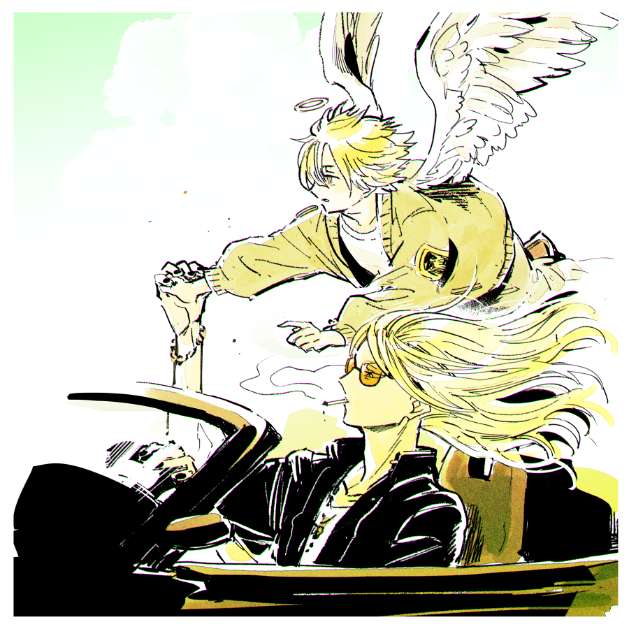 2boys angel_wings black_jacket blonde_hair bracelet car cigarette cloud convertible daybit_sem_void driving fate/grand_order fate_(series) feathered_wings floating_hair flying halo jacket jewelry long_hair looking_to_the_side male_focus motor_vehicle multiple_boys nobicco open_clothes open_jacket orange-tinted_eyewear shirt short_hair simple_background smoke smoking sunglasses tezcatlipoca_(fate) tinted_eyewear upper_body white_shirt wings