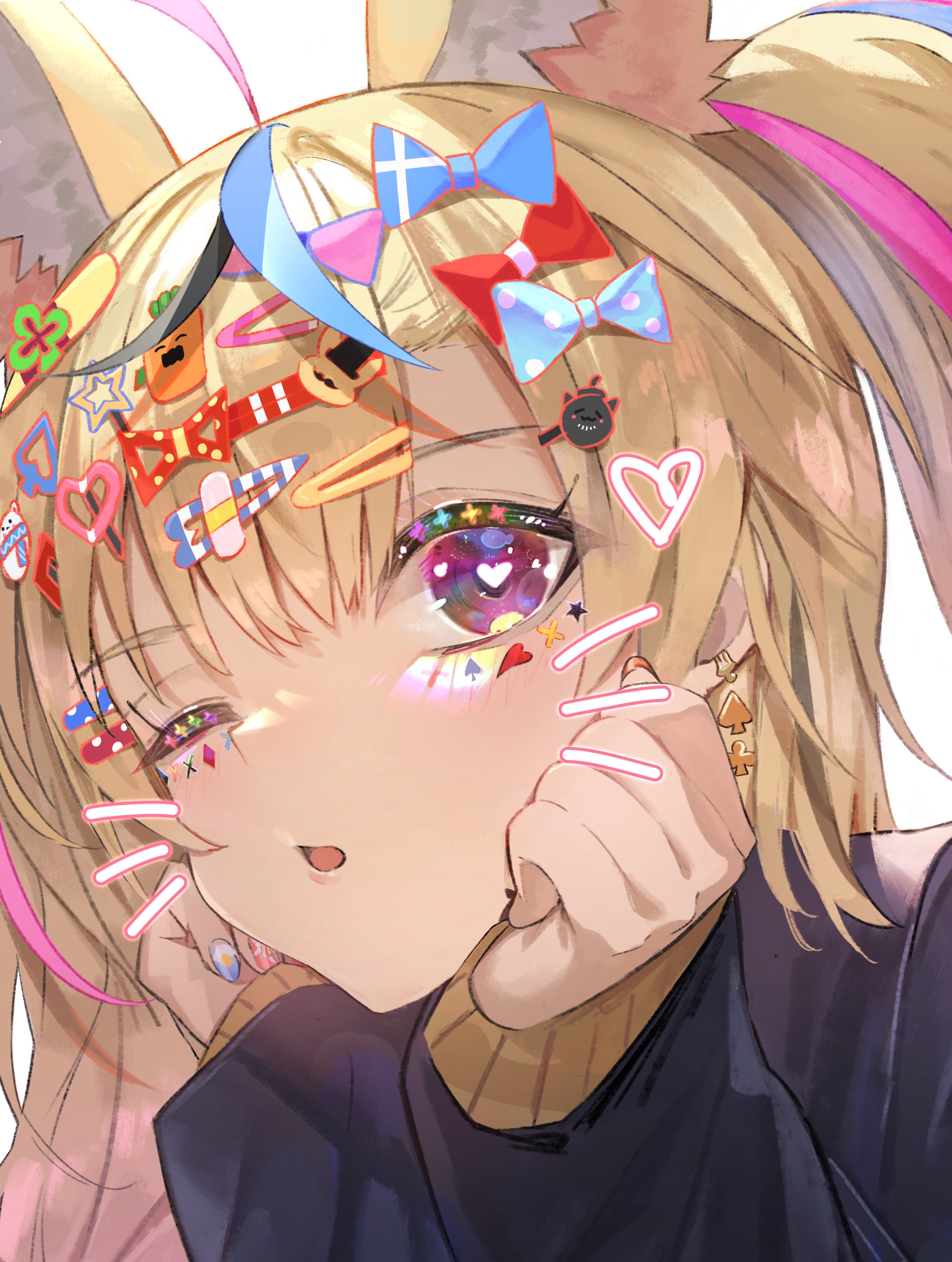 1girl absurdres animal_ear_fluff animal_ears black_hair black_jacket blonde_hair blue_hair blue_nails bow commentary drawn_whiskers earrings facial_mark fox_ears fox_girl hair_bow hair_ornament hairpin hands_on_own_cheeks hands_on_own_face hands_up heart heart-shaped_pupils highres hololive jacket jewelry kouhiipan light_blush long_sleeves looking_at_viewer medium_hair multicolored_hair multicolored_nails multiple_hair_bows multiple_hairpins nail_art nail_polish official_alternate_costume official_alternate_hairstyle omaru_polka omaru_polka_(school_uniform) one_eye_closed parted_lips pink_hair pink_nails purikura purple_eyes school_uniform simple_background solo streaked_hair symbol-shaped_pupils upper_body virtual_youtuber white_background