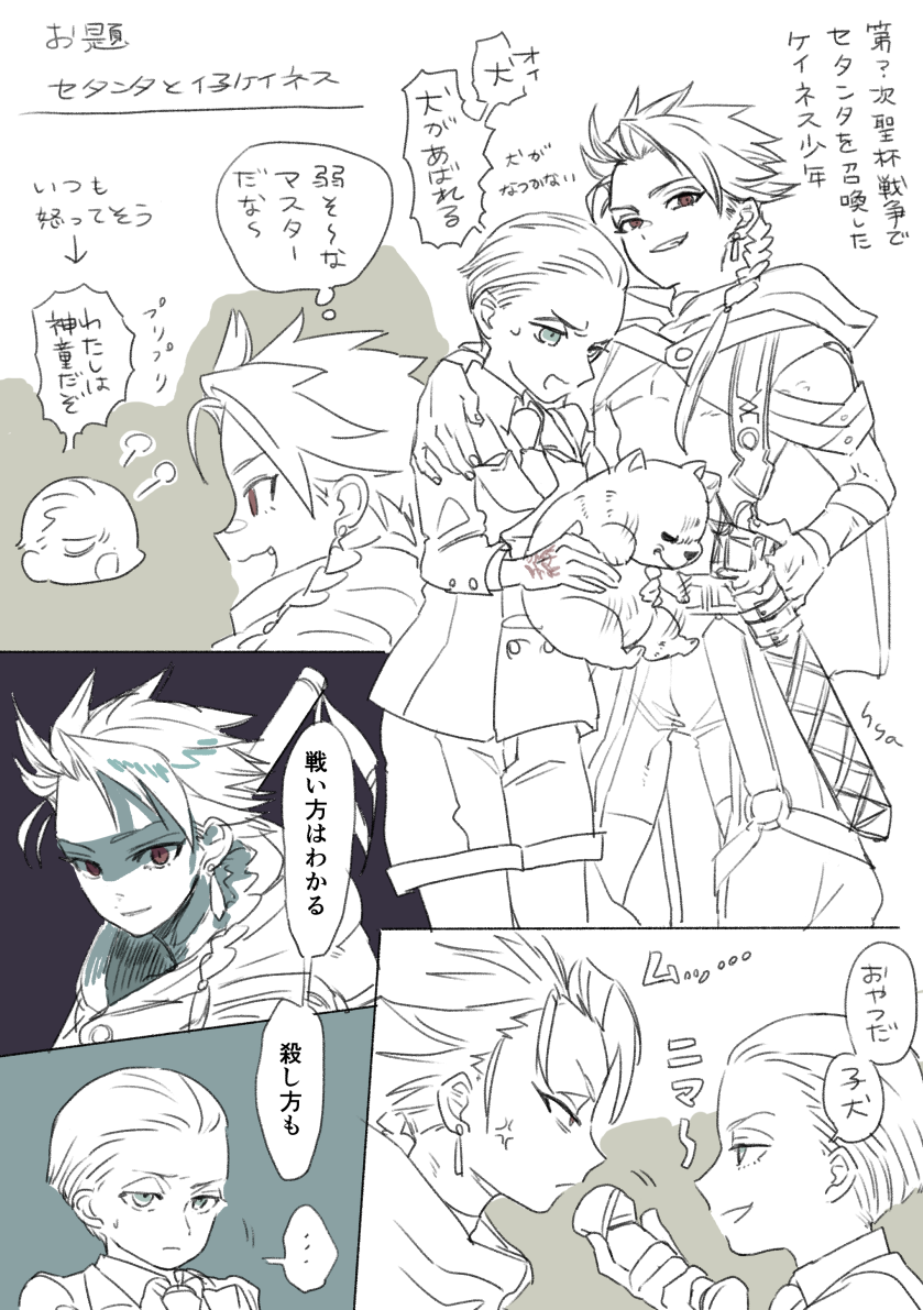 2boys aged_down alternate_costume alternate_universe anger_vein angry animal arm_around_shoulder baby_animal bodysuit bodysuit_under_clothes braid braided_ponytail capelet child comic command_spell cu_chulainn_(fate) dog fate/grand_order fate/grand_order_arcade fate/zero fate_(series) hair_slicked_back holding holding_animal holding_dog hood hooded_capelet hya_(ohyaarin) kayneth_el-melloi_archibald male_focus monochrome multiple_boys puppy samoyed_(dog) setanta_(fate) shaded_face spiked_hair spot_color sweatdrop talking translation_request white_dog