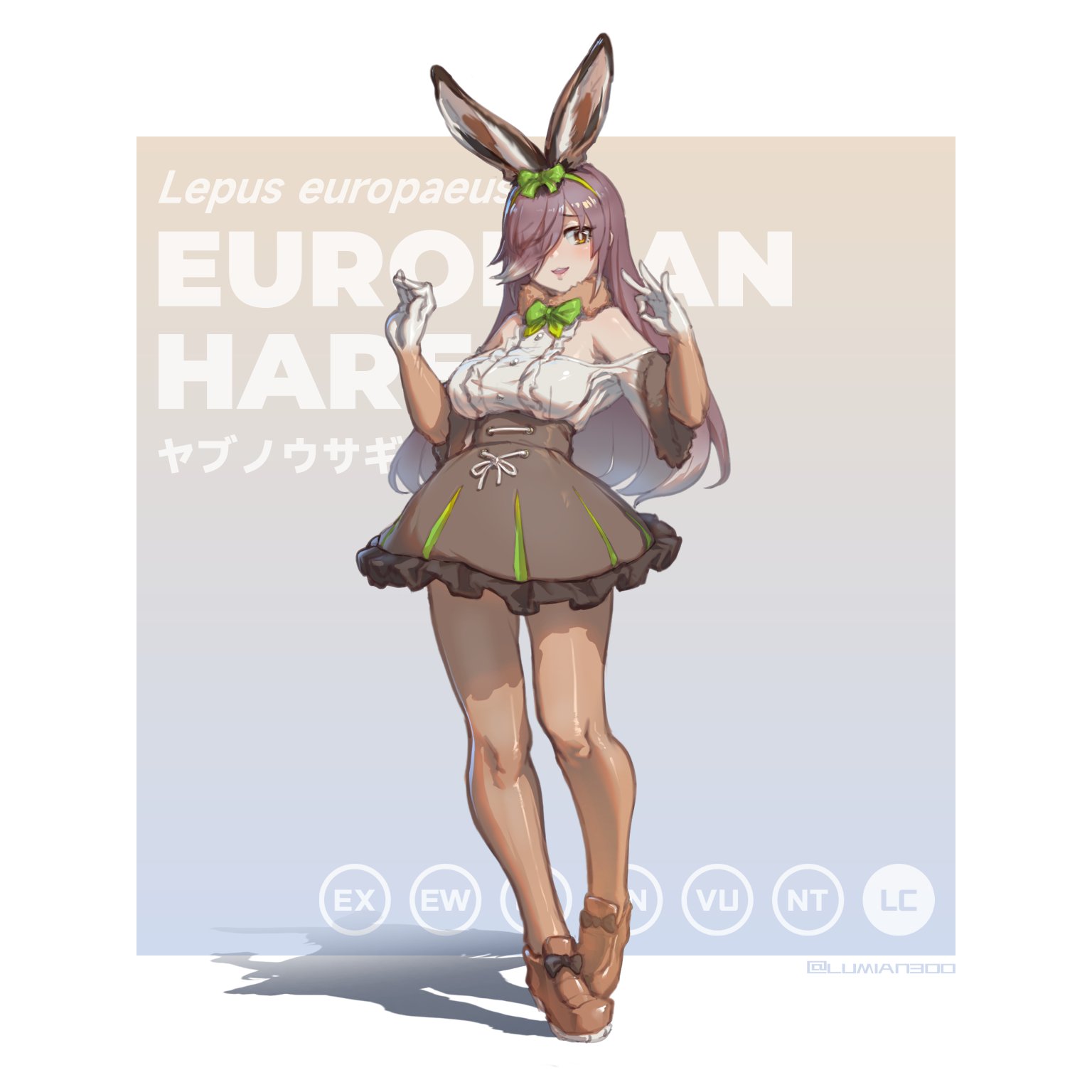 1girl animal_ears bare_shoulders blush bow bowtie brown_fur brown_gloves brown_hair brown_pantyhose brown_shoes brown_skirt center_frills elbow_gloves english_text european_hare_(kemono_friends) extra_ears frilled_skirt frills full_body fur_collar gloves gradient_gloves green_bow green_bowtie hair_bow hair_over_one_eye high-waist_skirt highres kemono_friends latin_text loafers long_hair lumian300 multicolored_hair pantyhose rabbit_ears rabbit_girl rabbit_tail shirt shoes skirt sleeveless solo tail translation_request two-tone_gloves white_gloves white_hair white_shirt