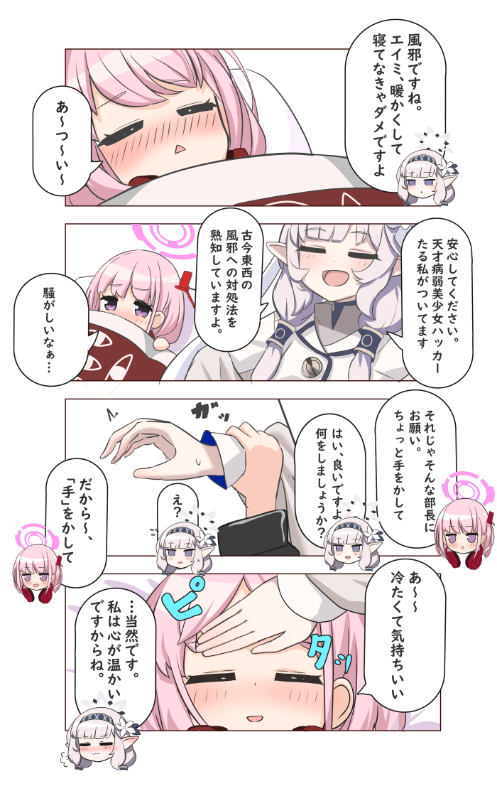 2girls 4koma :d blue_archive blunt_bangs blush comic commentary_request eimi_(blue_archive) fever flower futon grey_eyes grey_hair hair_between_eyes hair_flower hair_ornament hairband halo headphones headphones_around_neck himari_(blue_archive) long_hair long_sleeves looking_at_another lying multiple_girls on_back open_mouth parted_lips pillow pink_hair pointy_ears purple_eyes shooka short_hair sick sidelocks smile translation_request triangle_mouth