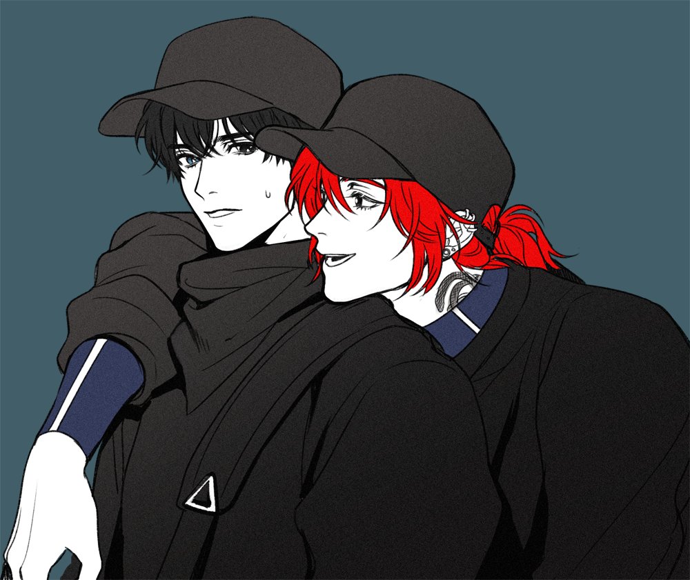 2boys arm_around_shoulder baseball_cap black_hair black_headwear black_shirt blue_background commentary_request ear_piercing earrings eoduun_badaui_deungbul-i_doeeo hair_between_eyes hat heterochromia jewelry kim_jaehee korean_commentary long_hair looking_at_another male_focus multiple_boys neck_tattoo open_mouth padakpadak_88 park_moo-hyun piercing ponytail red_hair shirt short_hair simple_background smile snake_tattoo tattoo upper_body