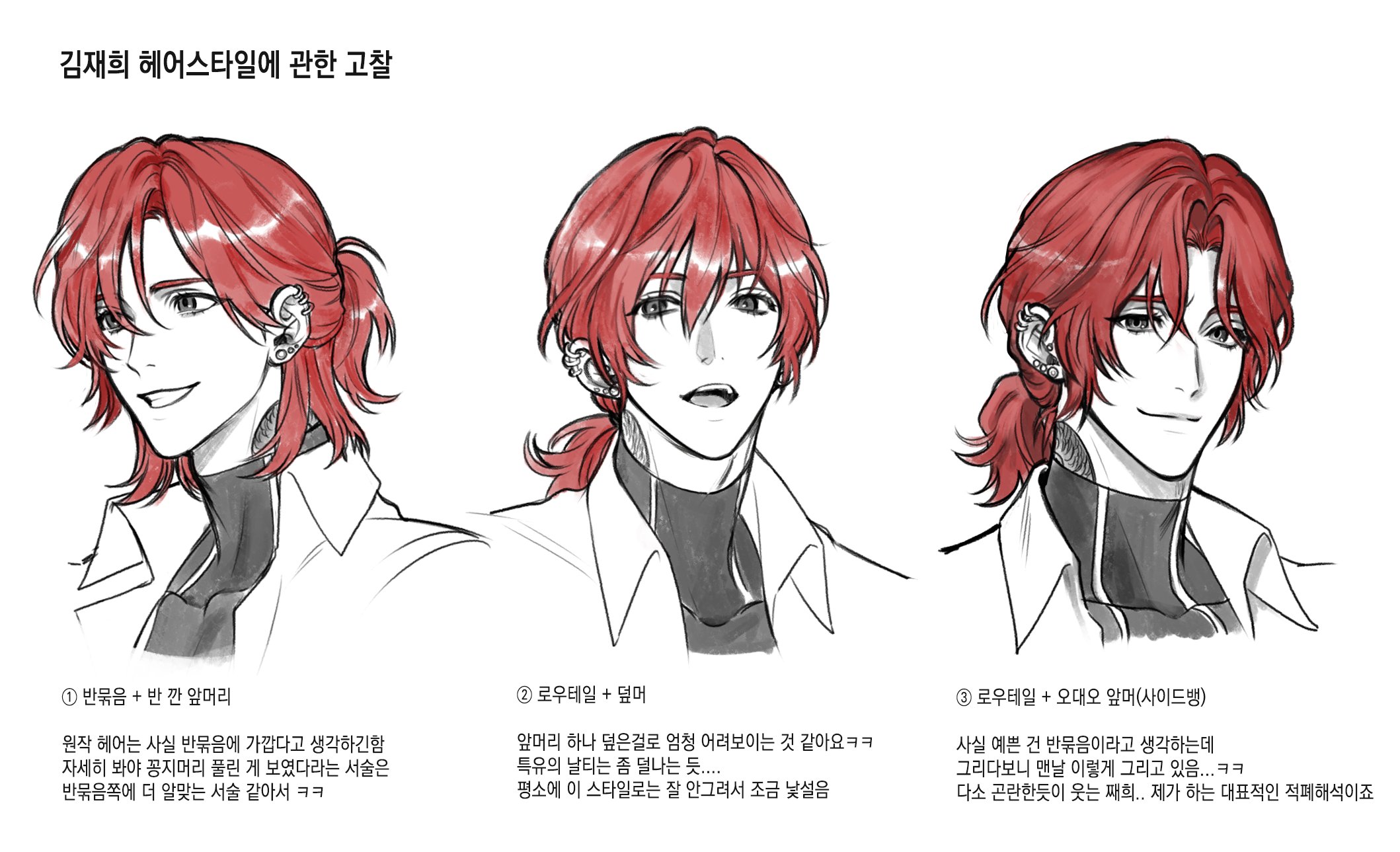 1boy closed_mouth commentary_request ear_piercing earrings eoduun_badaui_deungbul-i_doeeo hair_between_eyes highres jewelry kim_jaehee korean_commentary korean_text long_hair looking_at_viewer male_focus multiple_views neck_tattoo open_mouth padakpadak_88 partially_colored piercing ponytail red_hair simple_background smile tattoo translation_request upper_body white_background