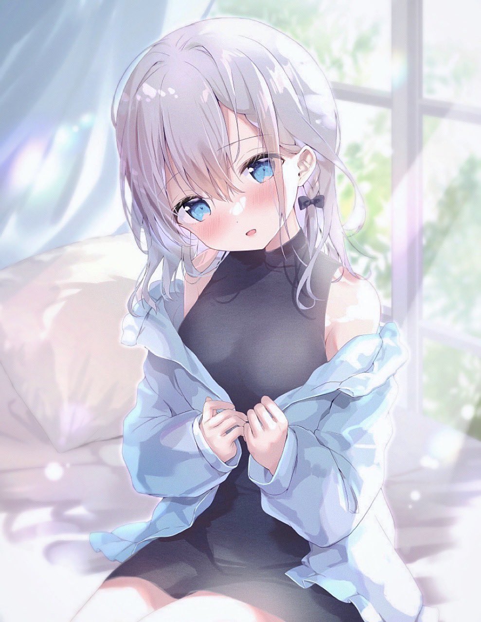 1girl :d amedamacon bare_shoulders bed_sheet black_bow black_dress blue_eyes blue_jacket bow braid breasts commentary_request curtains day dress grey_hair hair_between_eyes hair_bow hands_up head_tilt highres indoors jacket long_hair long_sleeves looking_at_viewer medium_breasts off_shoulder open_clothes open_jacket open_mouth original pillow puffy_long_sleeves puffy_sleeves sitting sleeveless sleeveless_dress sleeves_past_wrists smile solo sunlight window