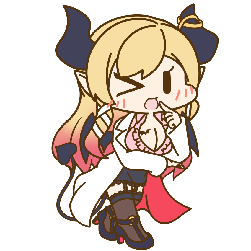 >_< 1girl aka_shiba bat_tattoo black_footwear black_horns blonde_hair breast_lift breast_tattoo breasts chibi cleavage coat demon_girl demon_horns demon_tail demon_wings flat_color full_body garter_straps gradient_hair hololive horn_ornament horn_ring horns lab_coat large_breasts multicolored_hair official_art one_eye_closed pointy_ears red_hair solo tail tattoo transparent_background two-sided_fabric virtual_youtuber white_coat winged_heart winged_heart_tattoo wings yuzuki_choco yuzuki_choco_(1st_costume) |_|