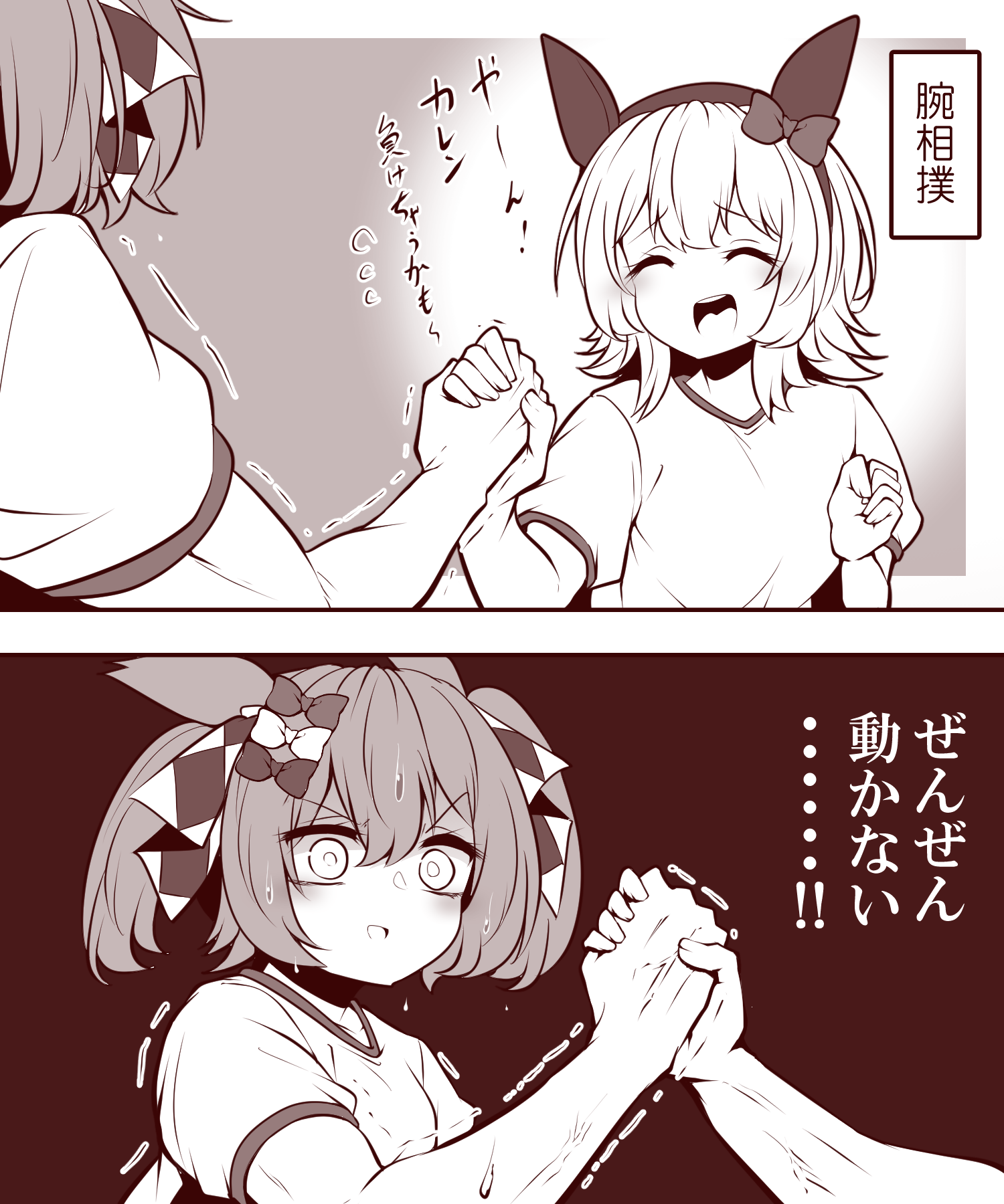 2koma animal_ears arm_wrestling bow bright_pupils checkered_bow checkered_clothes closed_eyes comic commentary curren_chan_(umamusume) ear_bow ear_covers gym_shirt hair_between_eyes hair_bow hairband highres holding_hands horse_ears horse_girl medium_hair monochrome multiple_hair_bows sepia shirt short_sleeves smart_falcon_(umamusume) strong sweatdrop translated trembling twintails umamusume upper_body v-shaped_eyebrows yonedatomo_mizu