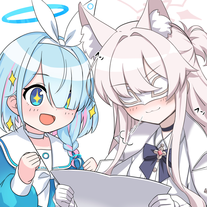+_+ 2girls :3 :d akira_(blue_archive) animal_ear_fluff animal_ears arona_(blue_archive) black_bow black_bowtie black_choker blue_archive blue_eyes blue_serafuku bow bowtie braid brooch cat_ears choker coat coat_on_shoulders colored_inner_hair eye_mask gloves hair_over_one_eye halo holding holding_paper jewelry light_blush mask medium_hair multicolored_hair multiple_girls open_mouth paper pink_hair sailor_collar school_uniform serafuku shirt shooka single_braid smile white_bow white_bowtie white_choker white_coat white_gloves white_hair white_sailor_collar white_shirt