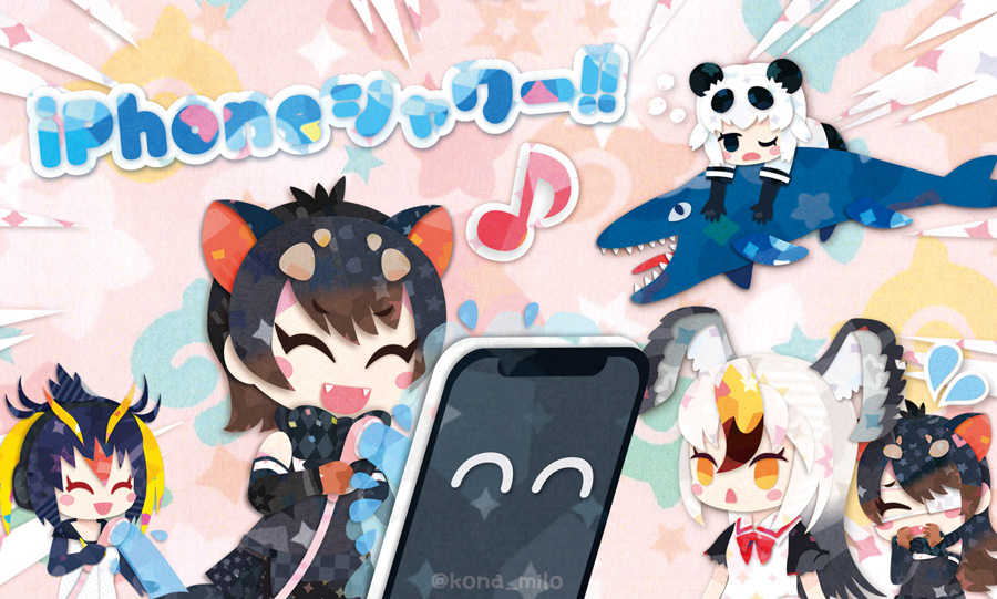 animal_ears australian_devil_(kemono_friends) black-tailed_gull_(kemono_friends) black_hair cellphone extra_ears giant_panda_(kemono_friends) grey_hair kemono_friends kikuchi_milo long_hair phone rockhopper_penguin_(kemono_friends) short_hair smartphone tasmanian_devil_(kemono_friends)