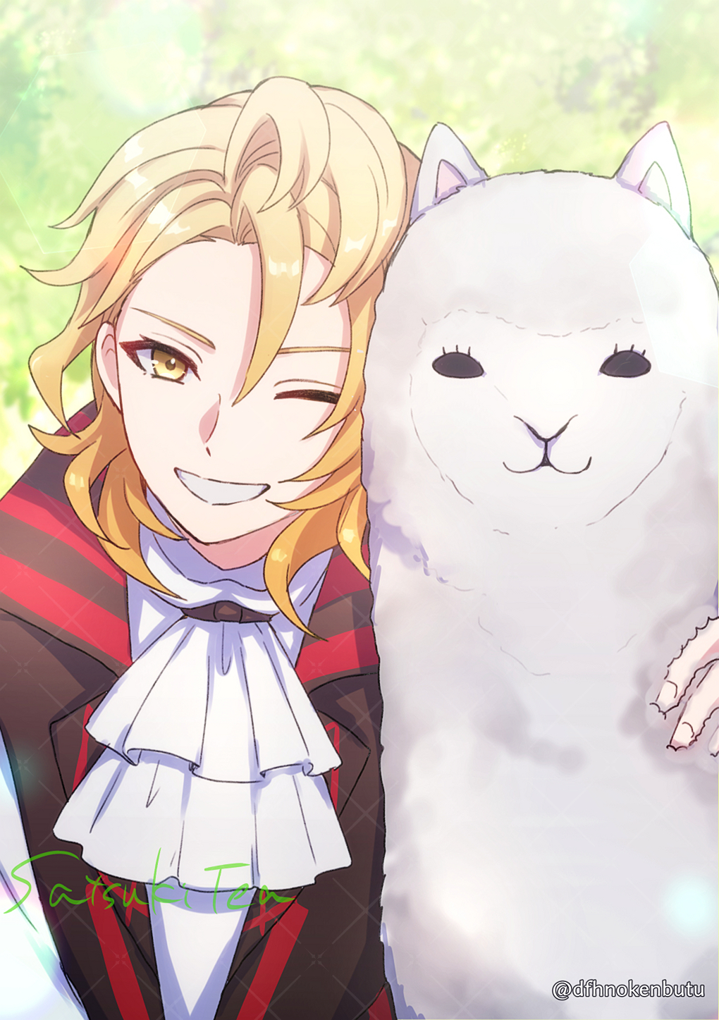 1boy alpaca amber_(fire_emblem) animal ascot blonde_hair dfhnokenbutu fire_emblem fire_emblem_engage grin highres looking_at_viewer male_focus nintendo one_eye_closed shirt short_hair smile solo white_ascot yellow_eyes