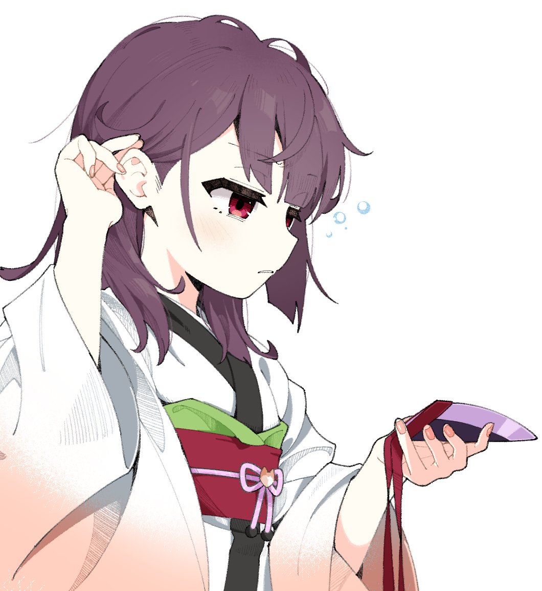 1girl blade brown_hair from_side frown hair_down hair_over_shoulder tucking_hair half-closed_eyes hand_up unworn_headgear holding japanese_clothes kimono konori_(ahurerukuiizi) light_blush long_sleeves looking_at_object medium_hair messy_hair obi obijime red_eyes sash simple_background squeans sleepy solo touhoku_kiritan upper_body voiceroid white_background white_kimono wide_sleeves