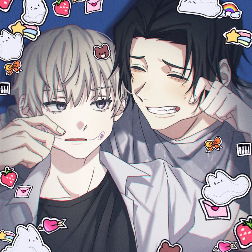 2boys black_hair black_shirt blue_background cheek_pull closed_eyes inumaki_toge jujutsu_kaisen male_focus medium_hair mi_muuuu multiple_boys okkotsu_yuta open_mouth shirt short_hair sticker sweatdrop white_hair