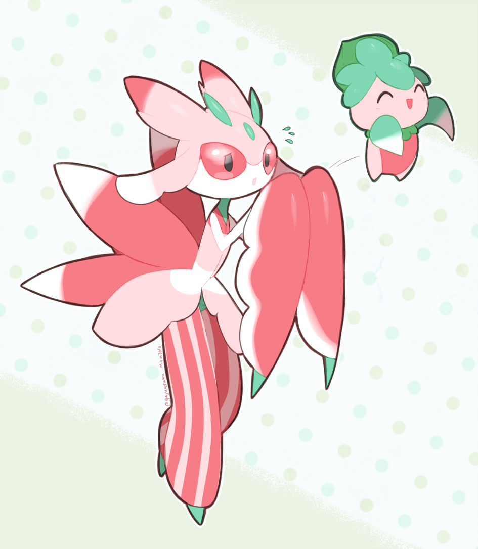 :d ^_^ claws closed_eyes commentary_request evolutionary_line flying_sweatdrops fomantis full_body gen_7_pokemon inaais lurantis motion_lines nintendo no_humans open_mouth pokemon pokemon_(creature) polka_dot polka_dot_background smile