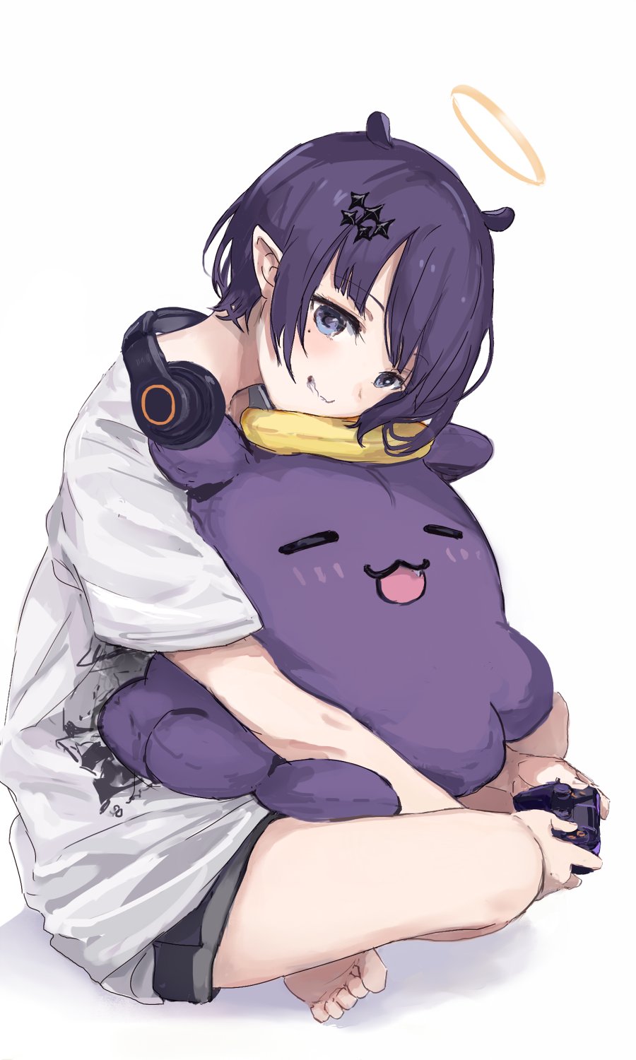 1girl barefoot blue_eyes controller crossed_legs fang game_controller halo headphones headphones_around_neck highres hololive hololive_english looking_at_viewer mole mole_under_eye ninomae_ina'nis ninomae_ina'nis_(loungewear) on_ground pointy_ears purple_hair shirt short_hair short_sleeves shorts simple_background sitting smile solo stuffed_animal stuffed_toy takodachi_(ninomae_ina'nis) virtual_youtuber white_background white_shirt yuuyu_(777)
