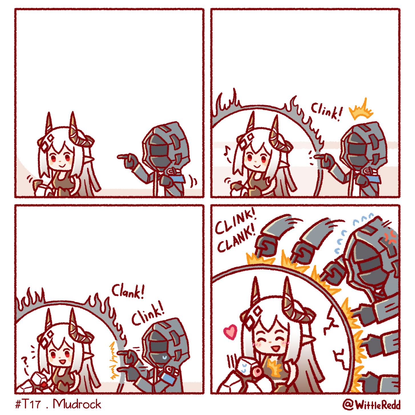 1girl 1other ambiguous_gender anger_vein arknights chibi comic demon_girl demon_horns doctor_(arknights) english_text golem heart highres horns mudrock_(arknights) mudrock_colossus_(arknights) pointy_ears shield twitter_username wittle_red