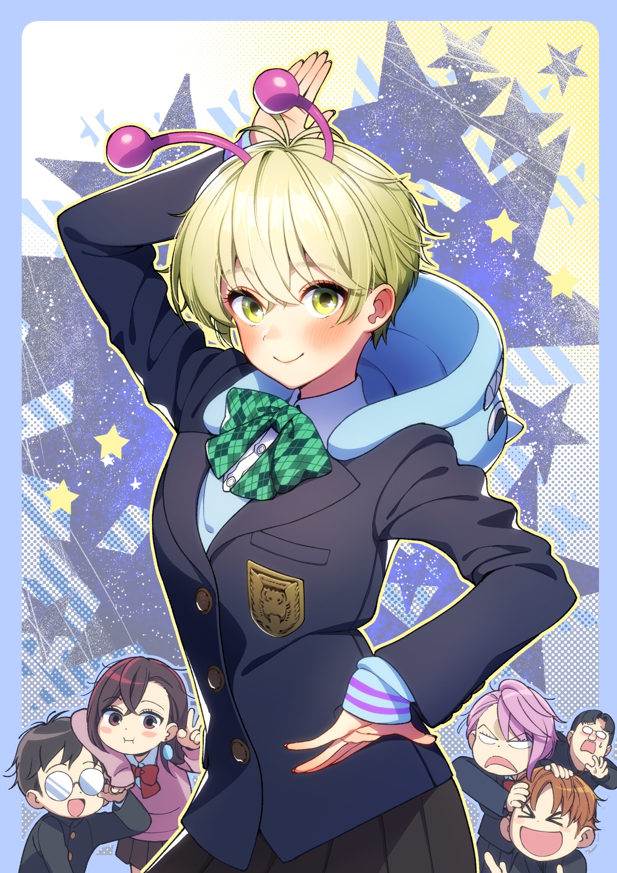 >_< 3boys 3girls antennae arm_up ayase_momo vamola_(dandadan) black_hair blue_hoodie blush bow brown_hair cardigan dandadan earrings frown gakuran green_eyes highres hood hoodie jewelry enjoji_jin komekome_chonpa medium_hair multiple_boys multiple_girls open_mouth pink_cardigan pink_hair red_bow round_eyewear sakata_kinta school_uniform shiratori_aira_(dandadan) short_hair smile takakura_ken_(dandadan) v vest