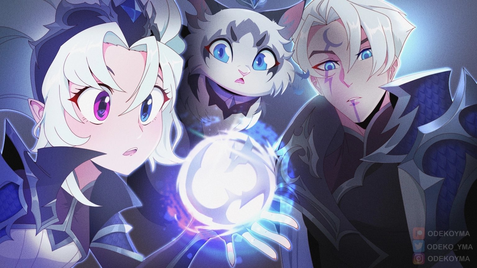 1boy 1girl animal aphelios artist_name ball black_gloves blue_eyes cat edg_aphelios edg_yuumi edg_zoe facial_mark fingerless_gloves gem gloves league_of_legends magic odeko_yma official_alternate_costume open_mouth ponytail short_hair teeth upper_body upper_teeth_only watermark white_hair yuumi_(league_of_legends) zoe_(league_of_legends)