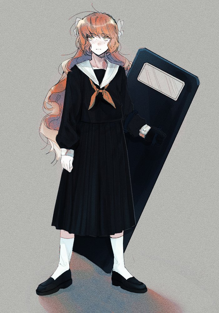 1girl black_footwear black_gloves black_serafuku black_shirt bow full_body gloves grey_background hair_bow hairband ishmael_(project_moon) limbus_company long_hair long_skirt long_sleeves necktie orange_hair orange_necktie project_moon riot_shield sailor_collar school_uniform serafuku shield shirt simple_background single_glove skirt socks solo vvindyday white_bow white_sailor_collar white_socks