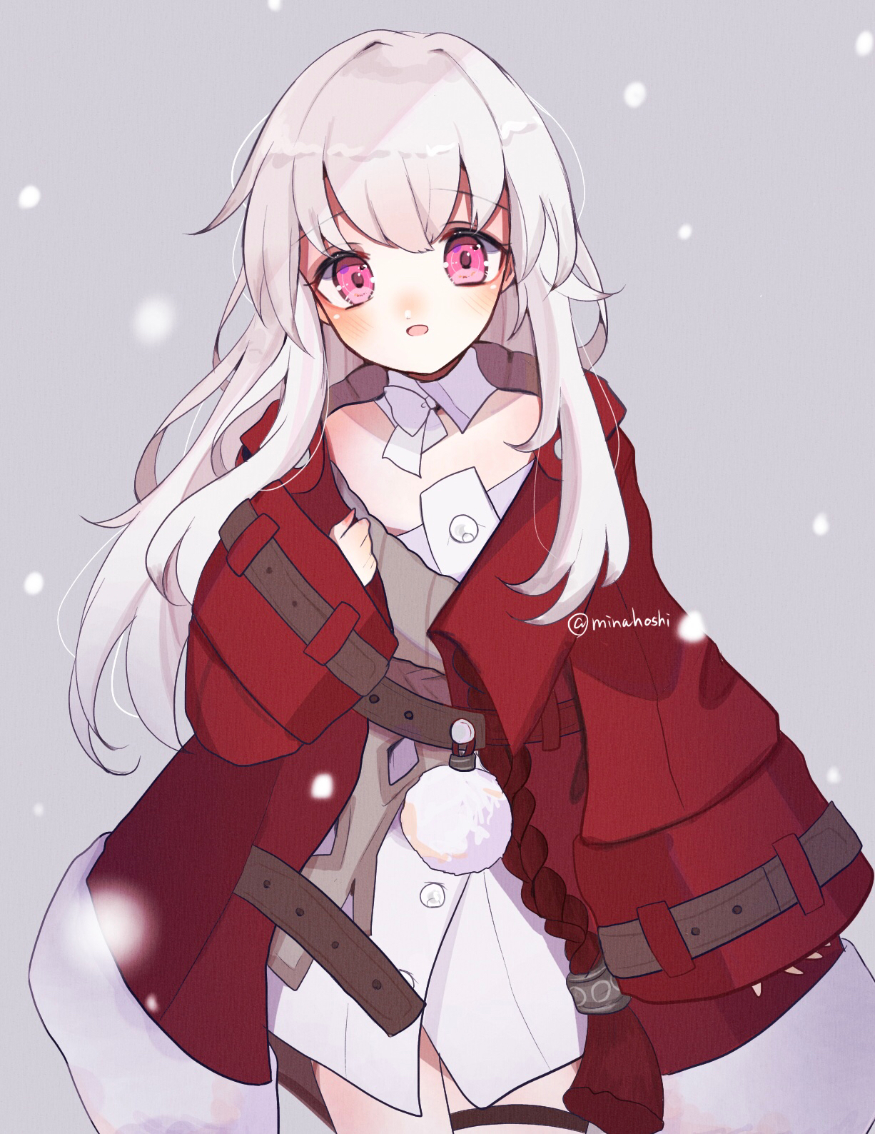 1girl artist_name clara_(honkai:_star_rail) collar commentary cowboy_shot detached_sleeves grey_background highres honkai:_star_rail honkai_(series) jacket long_hair long_sleeves looking_at_viewer minahoshi37 open_clothes open_jacket open_mouth red_eyes red_jacket short_hair simple_background sleeves_past_wrists snowing solo white_collar white_hair