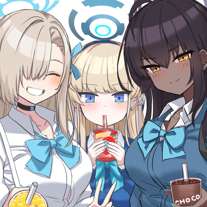 3girls :d ^_^ alternate_costume asuna_(blue_archive) asuna_(school_uniform)_(blue_archive) black_choker black_hair blue_archive blue_bow blue_bowtie blue_eyes blue_nails bow bowtie braid choker closed_eyes collarbone collared_shirt commentary_request cup dark-skinned_female dark_skin disposable_cup drinking drinking_straw drinking_straw_in_mouth earrings grin hair_between_eyes hair_bow hair_over_one_eye hair_ribbon hairband halo holding holding_cup jewelry karin_(blue_archive) karin_(school_uniform)_(blue_archive) light_brown_hair long_hair long_sleeves looking_at_viewer multicolored_hair multiple_girls nail_polish official_alternate_costume open_mouth ribbon school_uniform shirt shooka sidelocks simple_background single_braid smile streaked_hair toki_(blue_archive) toki_(school_uniform)_(blue_archive) two-tone_hair v white_background yellow_eyes