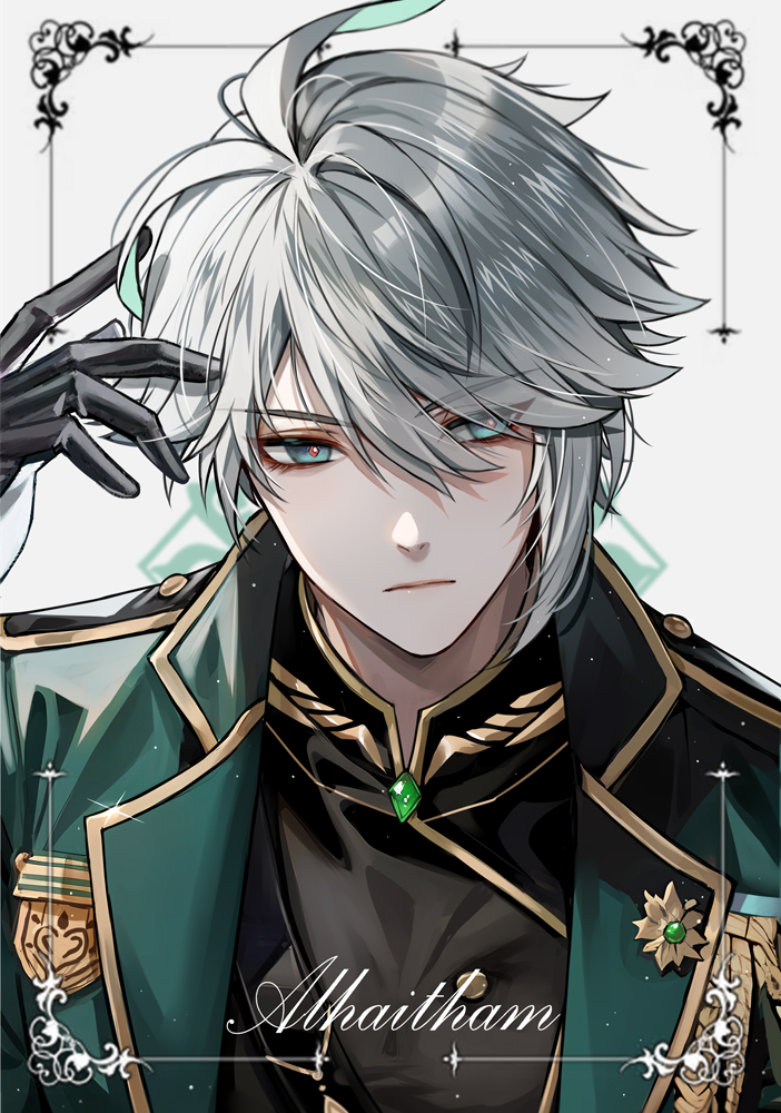1boy aguaaaaa4 alhaitham_(genshin_impact) alternate_costume aqua_eyes aqua_hair black_gloves black_shirt character_name formal_clothes genshin_impact gloves green_jacket grey_hair jacket male_focus multicolored_eyes multicolored_hair shirt short_hair solo white_background yellow_eyes