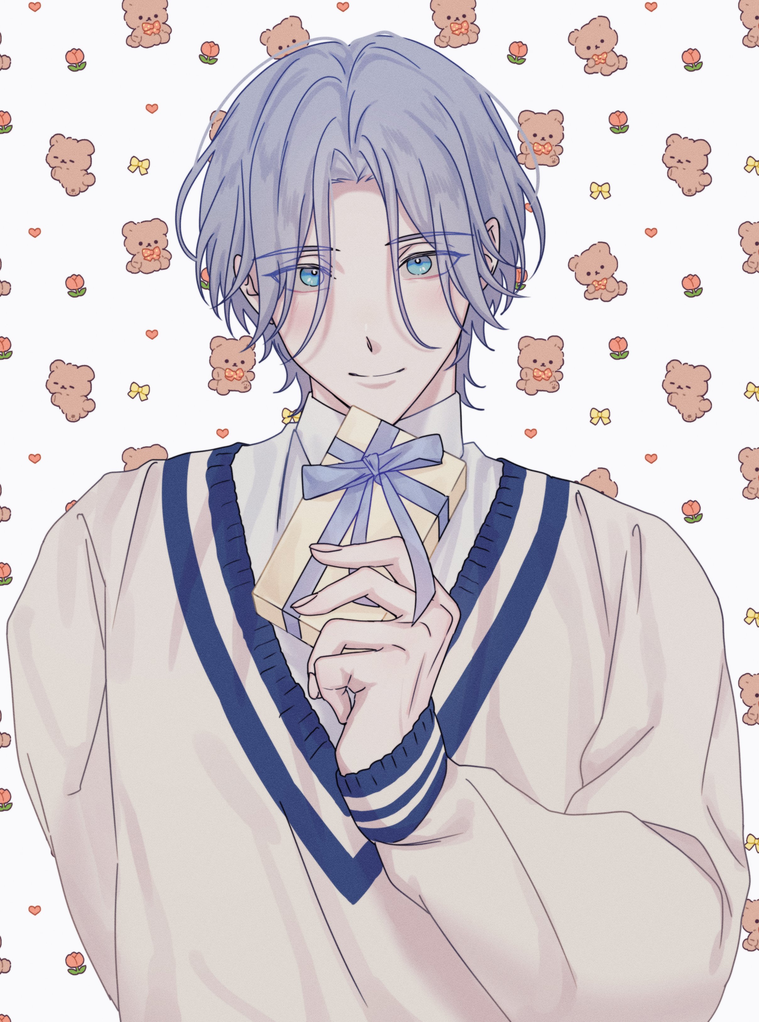 1boy absurdres arm_behind_back bishounen blue_eyes blue_hair bow closed_mouth collared_shirt commentary_request eyes_visible_through_hair floral_background gift hand_up hasegawa_langa highres holding holding_gift korean_commentary long_sleeves looking_at_viewer male_focus medium_hair mi_muuuu shirt simple_background sk8_the_infinity smile solo split_mouth straight-on sweater_vest upper_body white_background yellow_bow