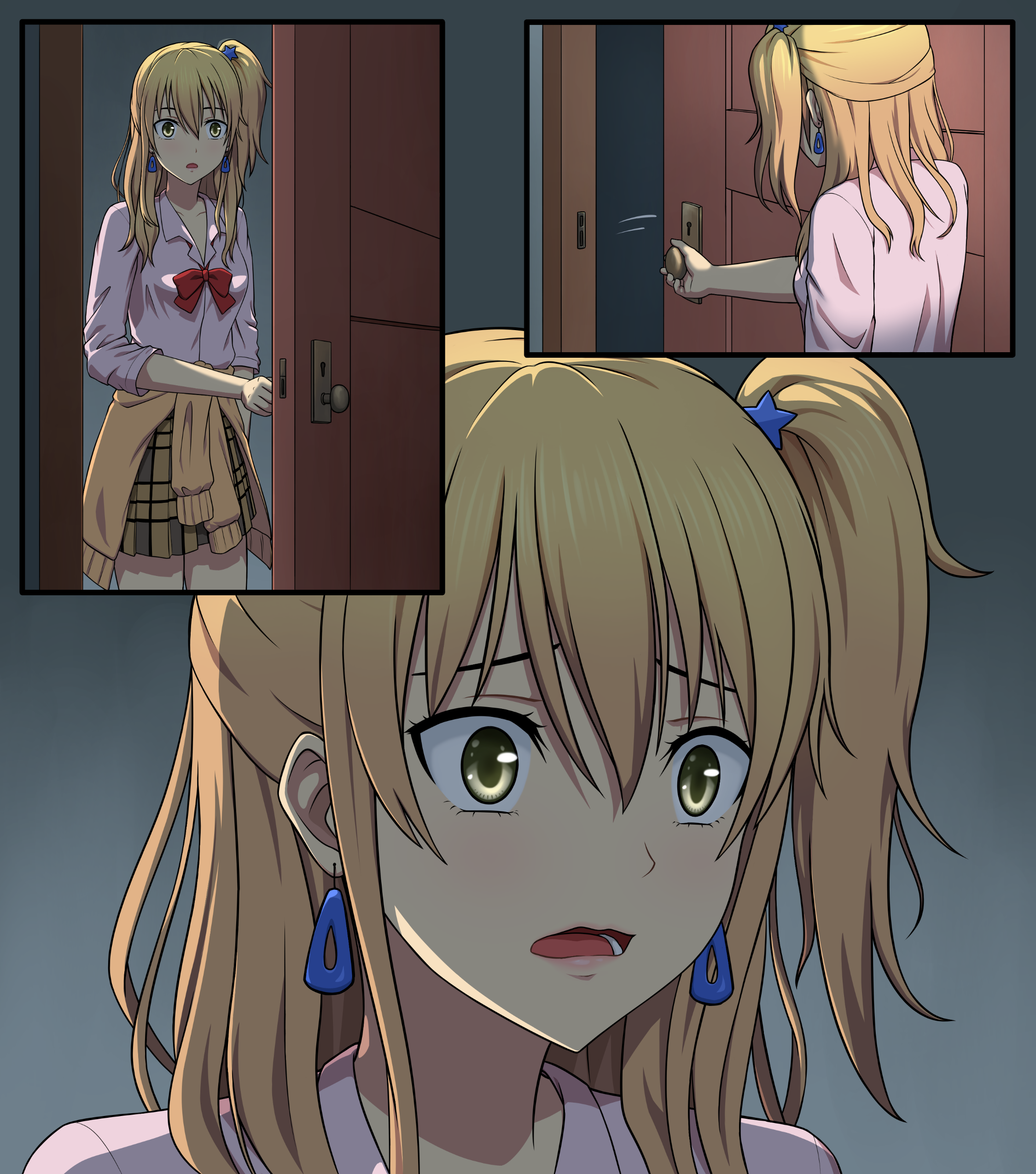1girl absurdres blonde_hair citrus_(saburouta) clothes_around_waist collared_shirt comic cursed_tv door dress_shirt earrings highres jewelry long_hair open_mouth opening_door pink_shirt pleated_skirt school_uniform shirt side_ponytail sidelocks skirt surprised sweater sweater_around_waist yellow_eyes yellow_skirt