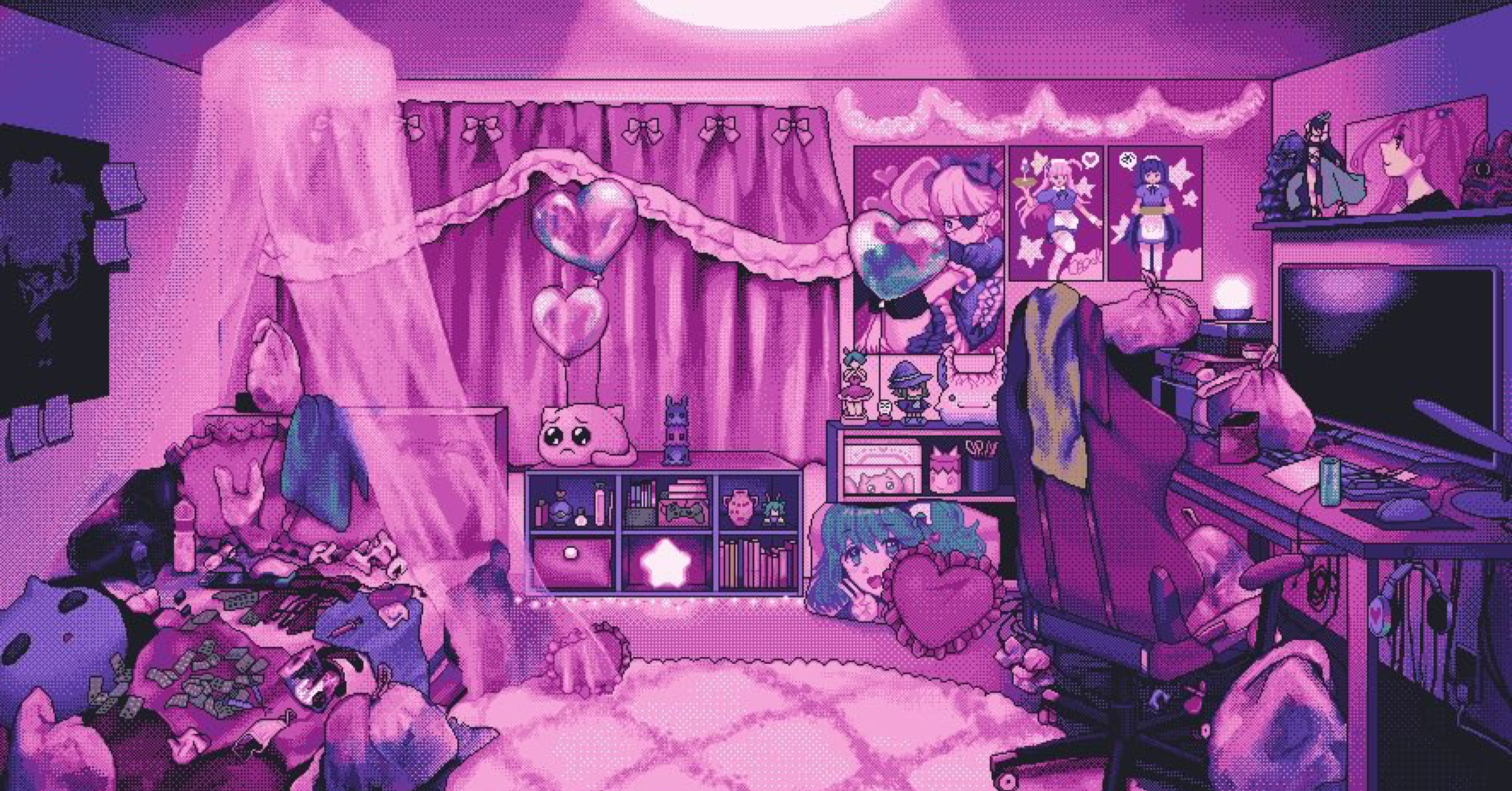 bag balloon bed can carpet chair curtains cushion decorations desk eencya emoji figure headphones heart heart_balloon heart-shaped_pillow highres indoors computer_keyboard lamp medicine monitor computer_mouse needy_girl_overdose no_humans office_chair official_art pillow pink_theme plastic_bottle pleading_face_emoji poster_(object) shelf still_life stuffed_toy swivel_chair syringe used_tissue