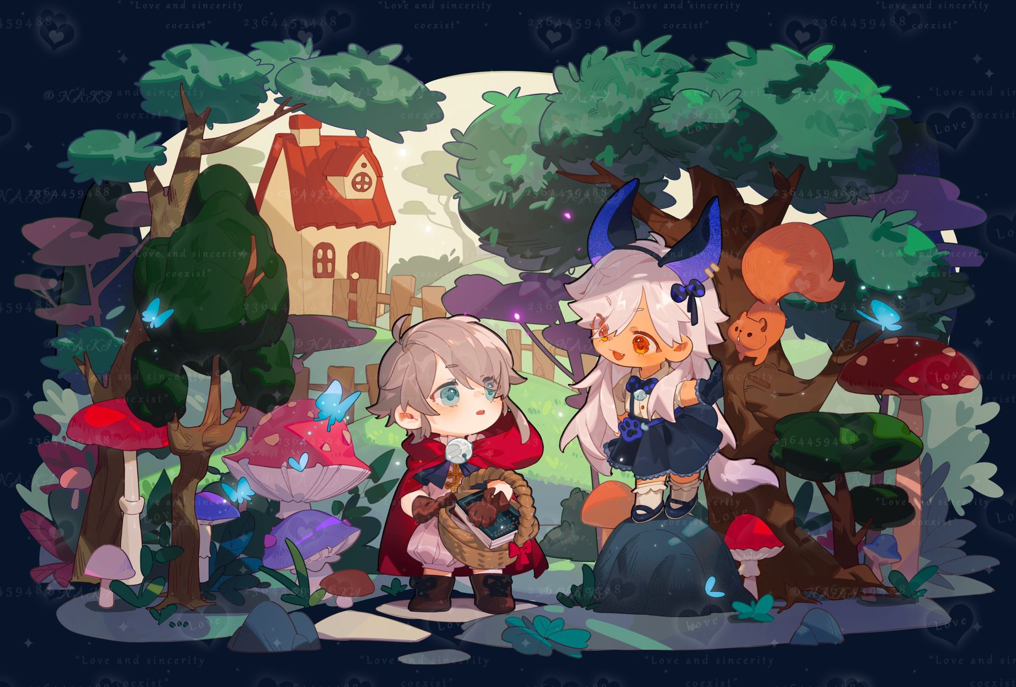 2boys :> ahoge alhaitham_(genshin_impact) animal_ears basket bell big_bad_wolf big_bad_wolf_(cosplay) black_footwear blue_bow blue_bowtie blue_butterfly book bow bowtie brown_footwear brown_gloves bug bus butterfly chibi chibi_only choro-nakini cloak commentary cosplay crossdressing crossdressing_(mtf) cyno_(genshin_impact) dark-skinned_male dark_skin elbow_carry english_commentary eyes_visible_through_hair genshin_impact gloves green_eyes grey_hair hair_over_one_eye highres hill holding holding_basket hood hooded_cloak insect little_red_riding_hood_(fairy_tale) little_red_riding_hood_(fairy_tale_character) little_red_riding_hood_(fairy_tale_character)_(cosplay) long_hair looking_at_another looking_up motor_vehicle multiple_boys mushroom neck_bell outdoors parted_lips red_cloak red_eyes shirt short_hair short_sleeves sidelocks socks squirrel stepping_stones tail tree white_shirt white_socks