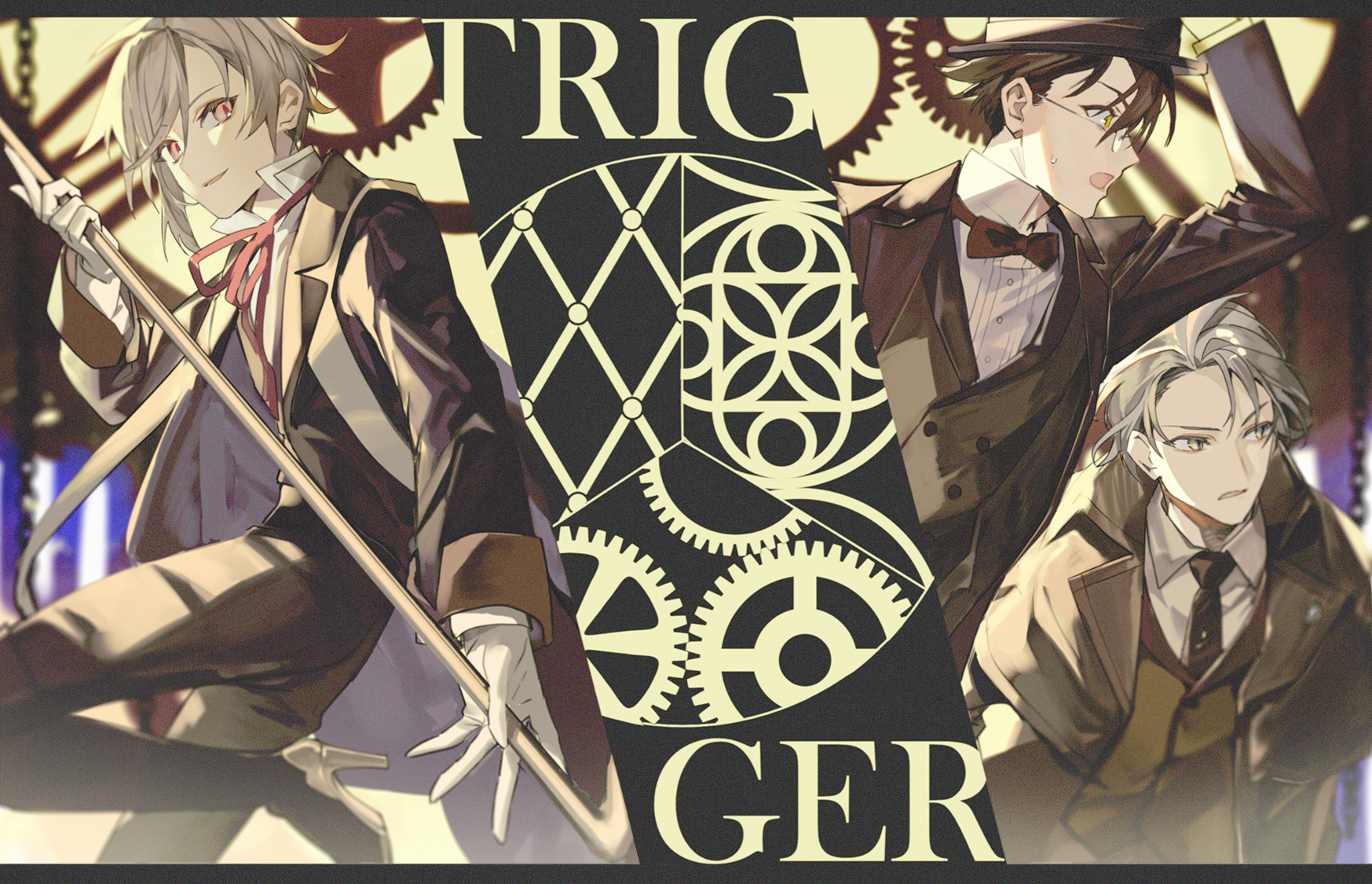 3boys brown_eyes brown_hair collared_shirt dot37_m formal_clothes glasses gloves grey_hair group_name highres idolish7 kujo_tenn long_sleeves looking_at_viewer looking_to_the_side male_focus multiple_boys necktie pink_eyes shirt short_hair suit trigger_(idolish7) tsunashi_ryunosuke tuxedo yaotome_gaku