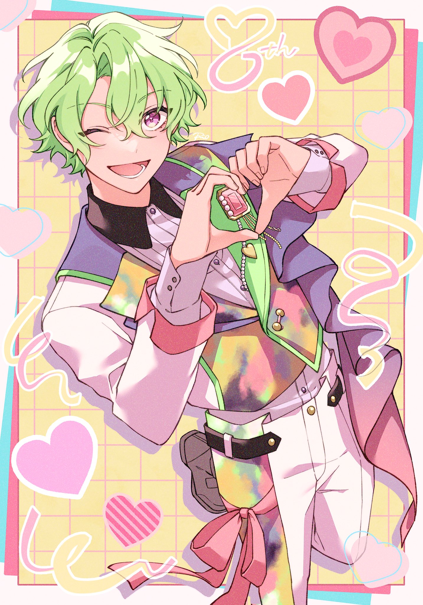 1boy buttons collared_shirt commentary ensemble_stars! green_hair heart heart_hands highres long_sleeves lower_teeth_only male_focus mcopoon one_eye_closed open_mouth purple_eyes red_ribbon ribbon shirt short_hair solo teeth tomoe_hiyori