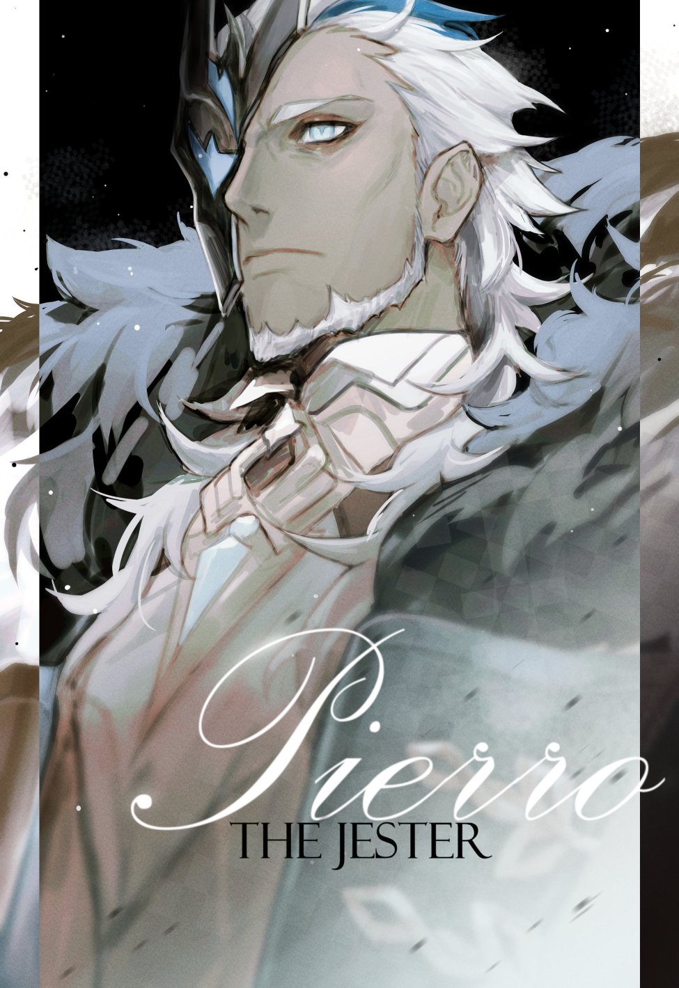 1boy aqua_eyes beard black_mask blue_hair character_name closed_mouth coat facial_hair fatui_coat fur-trimmed_coat fur_trim genshin_impact half_mask highres long_hair male_focus mask mask_over_one_eye multicolored_hair neekosiah pierro_(genshin_impact) simple_background solo upper_body white_hair