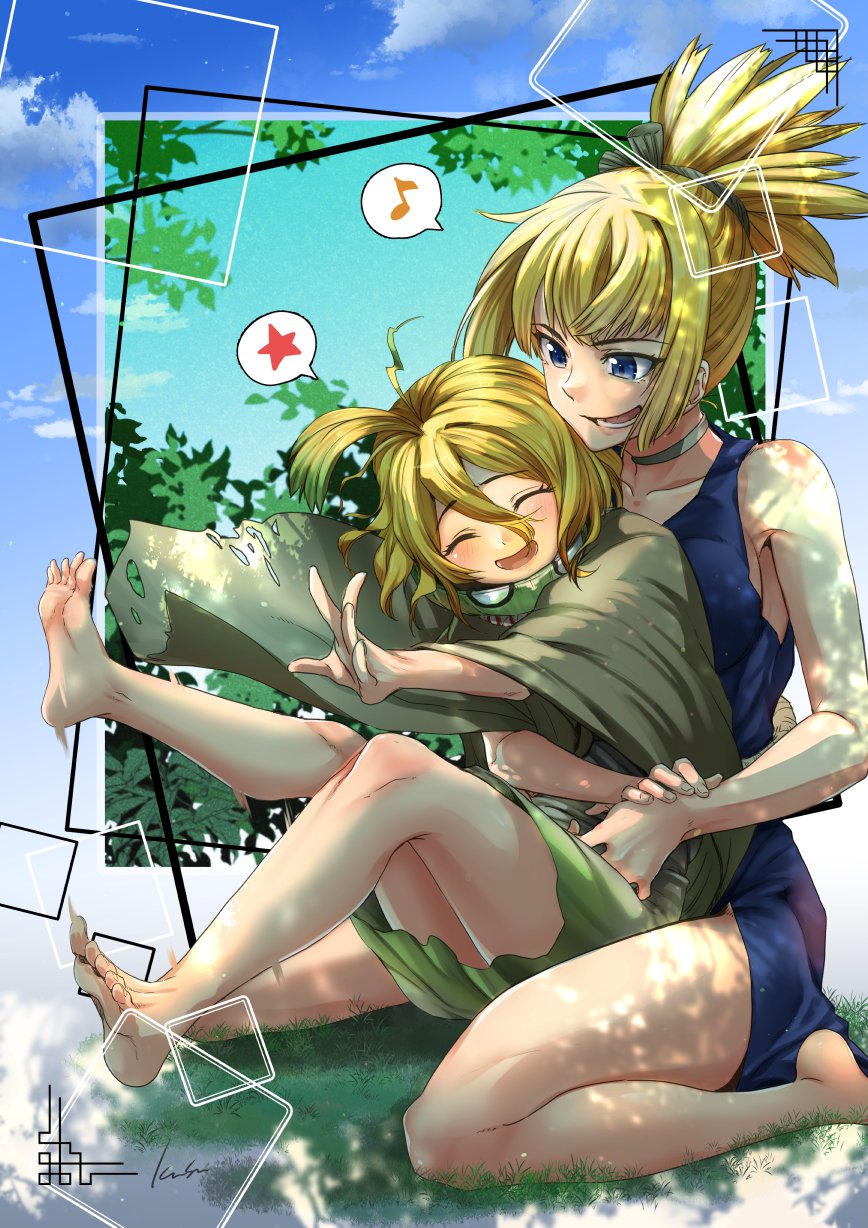 2girls bare_shoulders barefoot blonde_hair blue_dress blue_eyes choker commission dr._stone dress grin highres kohaku_(dr._stone) kusu_(moo1225) long_hair looking_at_another multiple_girls musical_note open_mouth ponytail short_hair sitting skeb_commission smile spoken_musical_note star_(symbol) suika_(dr._stone) wariza white_choker