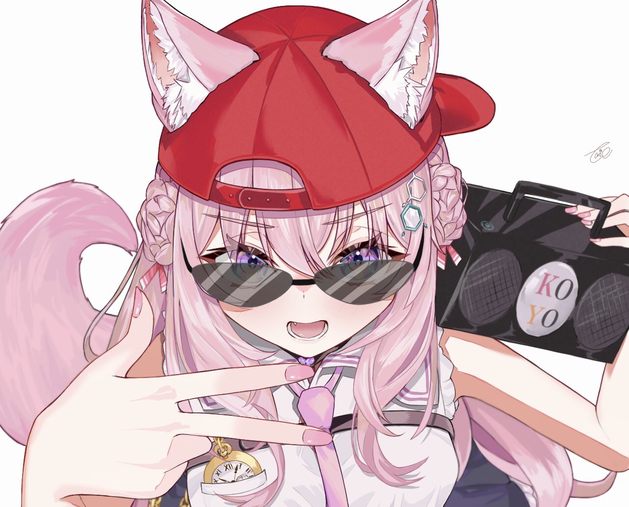 1girl animal_ear_fluff animal_ears baseball_cap boombox braid braided_bun chemical_structure coyote_girl fang from_above hair_bun hair_ornament hakui_koyori hat holding_boombox hololive long_hair looking_at_viewer necktie open_mouth pink_hair pink_nails pink_necktie pocket_watch purple_eyes shirt signature simple_background sleeveless sleeveless_shirt smile solo sunglasses tail takion upper_body v-shaped_eyebrows virtual_youtuber w watch white_background white_shirt