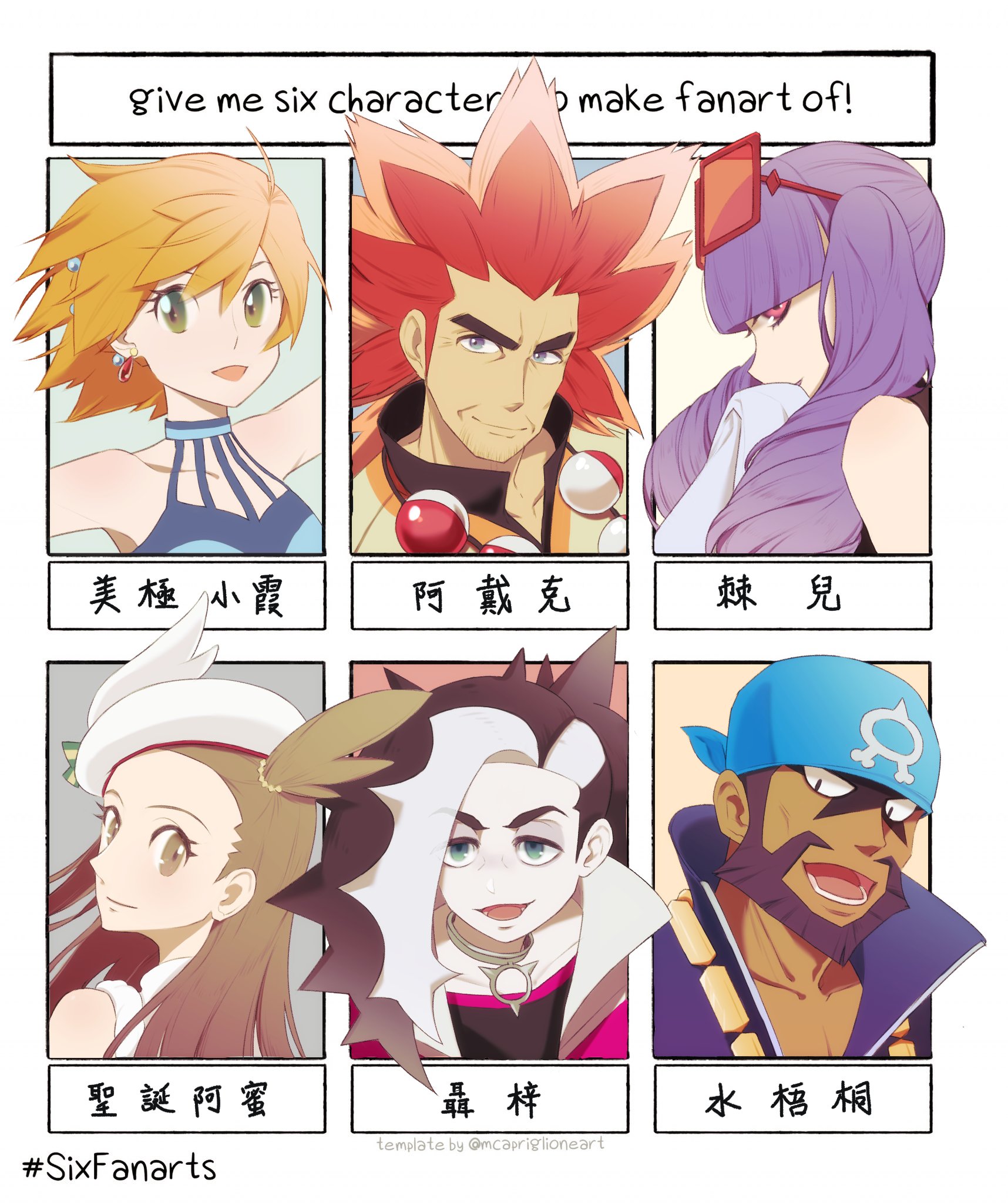 3boys 3girls alder_(pokemon) archie_(pokemon) bandana black_eyes blue_eyes brown_eyes brown_hair cdnagi dark-skinned_male dark_skin earrings eyewear_on_head green_eyes hat highres jasmine_(holiday_2022)_(pokemon) jasmine_(pokemon) jewelry long_hair looking_at_viewer misty_(pokemon) misty_(sygna_suit)_(pokemon) multiple_boys multiple_drawing_challenge multiple_girls nintendo official_alternate_costume open_mouth orange_hair piers_(pokemon) pokemon pokemon_black_and_white pokemon_masters_ex pokemon_omega_ruby_and_alpha_sapphire pokemon_sword_and_shield purple_eyes purple_hair rachel_(pokemon) short_hair six_fanarts_challenge sunglasses team_aqua