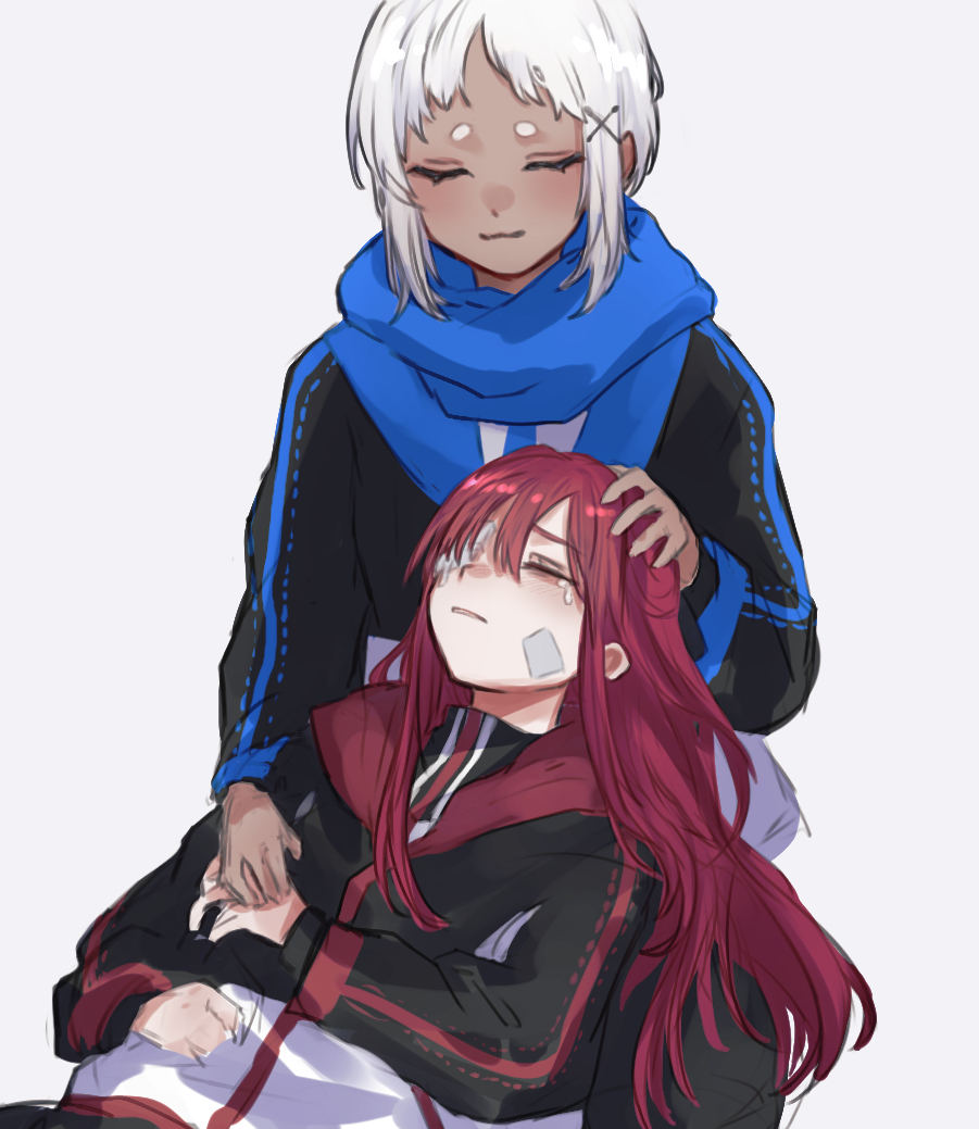 2girls aya_(project_moon) bandage_on_face bandage_over_one_eye bandages black_jacket black_pants black_shirt blue_scarf closed_eyes closed_mouth commentary_request crying dark-skinned_female dark_skin hair_ornament hand_on_another's_head jacket lap_pillow limbus_company long_sleeves moth_ram multiple_girls pants parted_lips project_moon scarf shirt short_hair simple_background smile white_background white_hair x_hair_ornament yuri_(project_moon)