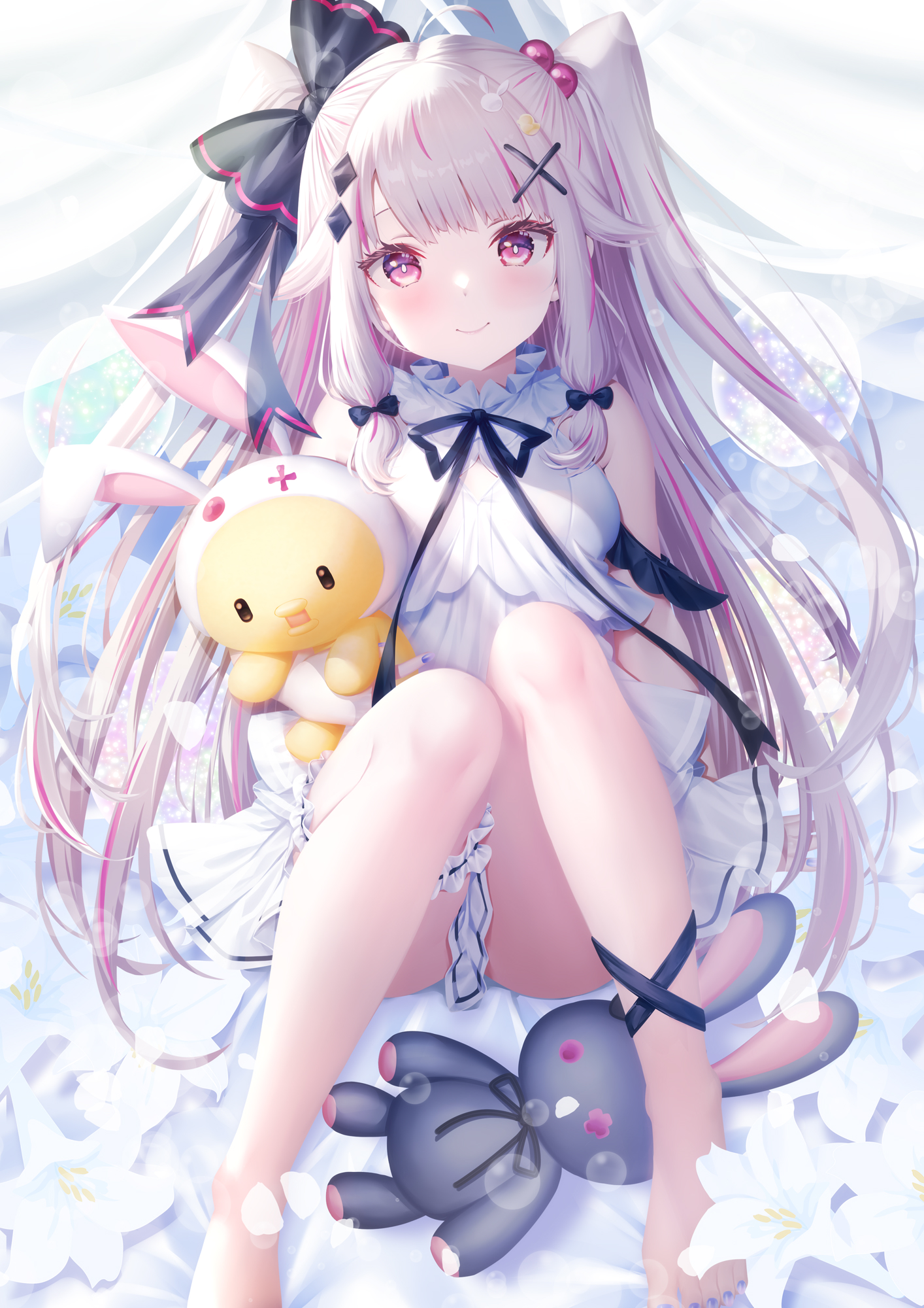 1girl ahoge barefoot black_bow bow dress hair_bow hair_ornament highres knees_together_feet_apart knees_up legs long_hair multicolored_hair nail_polish nijisanji pink_eyes pink_hair smile solo streaked_hair stuffed_animal stuffed_rabbit stuffed_toy toenail_polish toenails toes two_side_up virtual_youtuber white_dress white_hair x_hair_ornament yorumi_rena yorumi_rena_(young) zzz_(zzz00166403zzz)