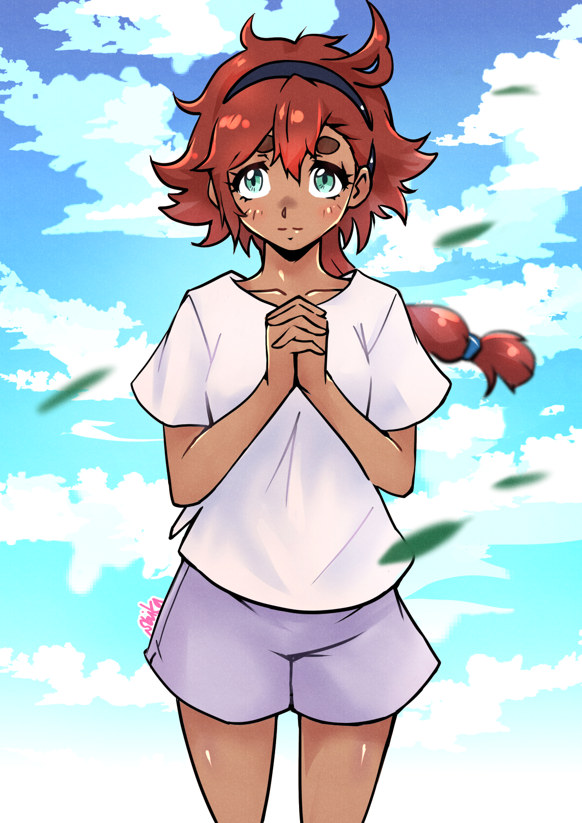 dark-skinned_female dark_skin female_focus green_eyes gundam gundam_suisei_no_majo highres red_hair saika_(pixiv43370196) shorts solo suletta_mercury
