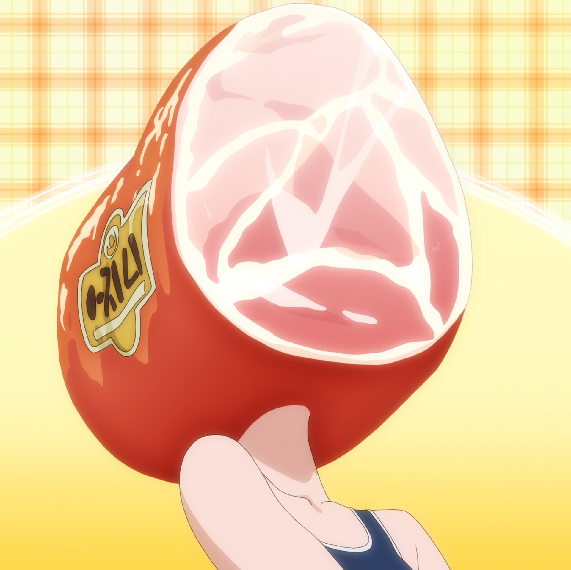 1girl adagaki_aki collarbone cosplay covered_face faceless faceless_female food ham highres kigurumi masamune-kun_no_revenge mask masked neck school_swimsuit screencap swimsuit tagme yellow_background